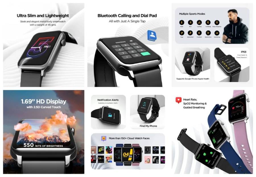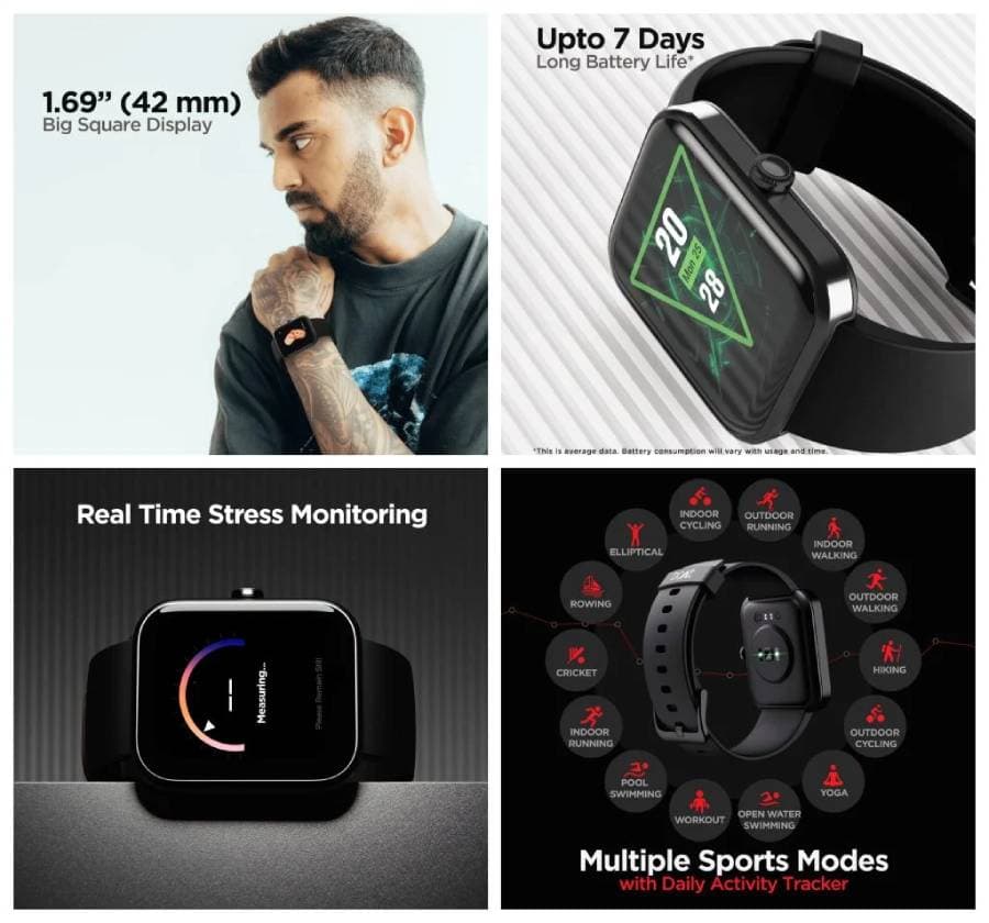 สมาร์ทวอทช์รุ่นนี้โดดเด่นด้วยกรอบโลหะที่สวยงาม พร้อมหน้าปัดนาฬิกาที่สามารถเปลี่ยนได้มากกว่า 100 แบบ และมีอายุการใช้งานแบตเตอรี่นานสูงสุด 10 วันต่อการชาร์จ 1 ครั้ง พร้อมด้วยการกันน้ำระดับ IP68, การโทรผ่าน Bluetooth และรองรับคำสั่งเสียง โดยจะมีให้เลือก 4 สีคือ Active black, Blue, Green และ Red ในราคา 3,499 รูปีอินเดีย (ประมาณ 1,650 บาท)