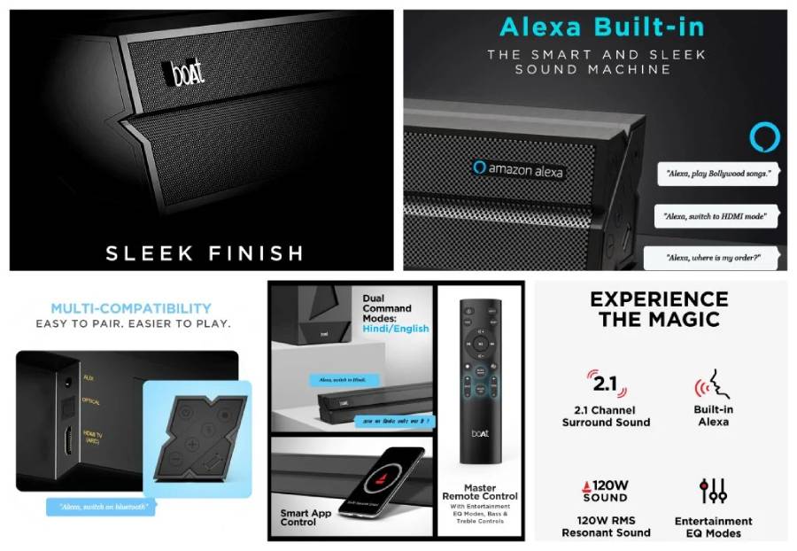 ซาวด์บาร์รุ่นนี้จะมาพร้อมดีไซน์และฟีเจอร์ที่เป็นเอกลักษณ์ พร้อมรองรับผู้ช่วยคำสั่งเสียงอย่าง Alexa ในการเข้าถึงฟังก์ชั่นและฟีเจอร์ต่างๆ และมีเสียงที่เป็นเอกลักษณ์อย่าง 120W RMS ของบริษัทเอง รวมถึงมีโหมด EQ, ไมโครโฟนแบบ Dual Far-field และอื่นๆ โดยซาวด์บาร์รุ่นนี้จะมาพร้อมกับไดรเวอร์ SW ขนาด 2.25 นิ้ว x 4 SB + 6.5 นิ้ว ในราคา 1,999 รูปีอินเดีย (ประมาณ 950 บาท) ซึ่งวางจำหน่ายแล้วใน Amazon Shopping