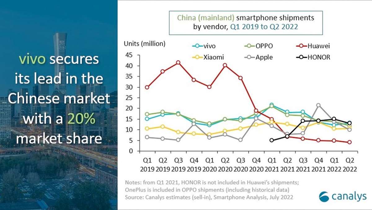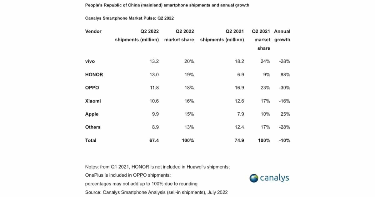 การจัดส่งสมาร์ทโฟนเฉพาะในจีนในช่วงไตรมาสที่ 2 ของปี 2022 นั้นลดลง 10% เมื่อเทียบกับปีที่ผ่านมา โดยทำยอดจัดส่งได้รวม 67.4 ล้านเครื่อง แต่มี HONOR กับ Apple ที่ยอดขายเติบโตเพิ่มขึ้น
