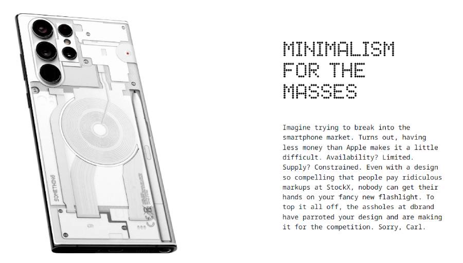 โดยทางแบรนด์ได้โพสต์ภาพโปรโมทของสติ๊กเกอร์ดังกล่าวด้วยฟอนต์ลายจุดที่เหมือนกับของแบรนด์ Nothing บนเว็บไซต์ พร้อมเขียนแคปชั่นปั่นประสาทว่า “การลอกเลียนแบบไม่ใช่อาชญากรรม” แถมยังเขียนข้อความแสบๆ ไว้บนภาพว่า “Nothing นั้นพยายามที่จะเจาะตลาดมือถือ แต่ไม่ได้มีเงินทุนเยอะเหมือน Apple ทำให้หาซื้อยากและต้องวางขาย phone (1) ในจำนวนจำกัด และถึงจะมีการเปิดประมูลใน StockX แต่สุดท้ายก็ไม่มีใครได้สัมผัสกับตัวสมาร์ทโฟนอยู่ดี”