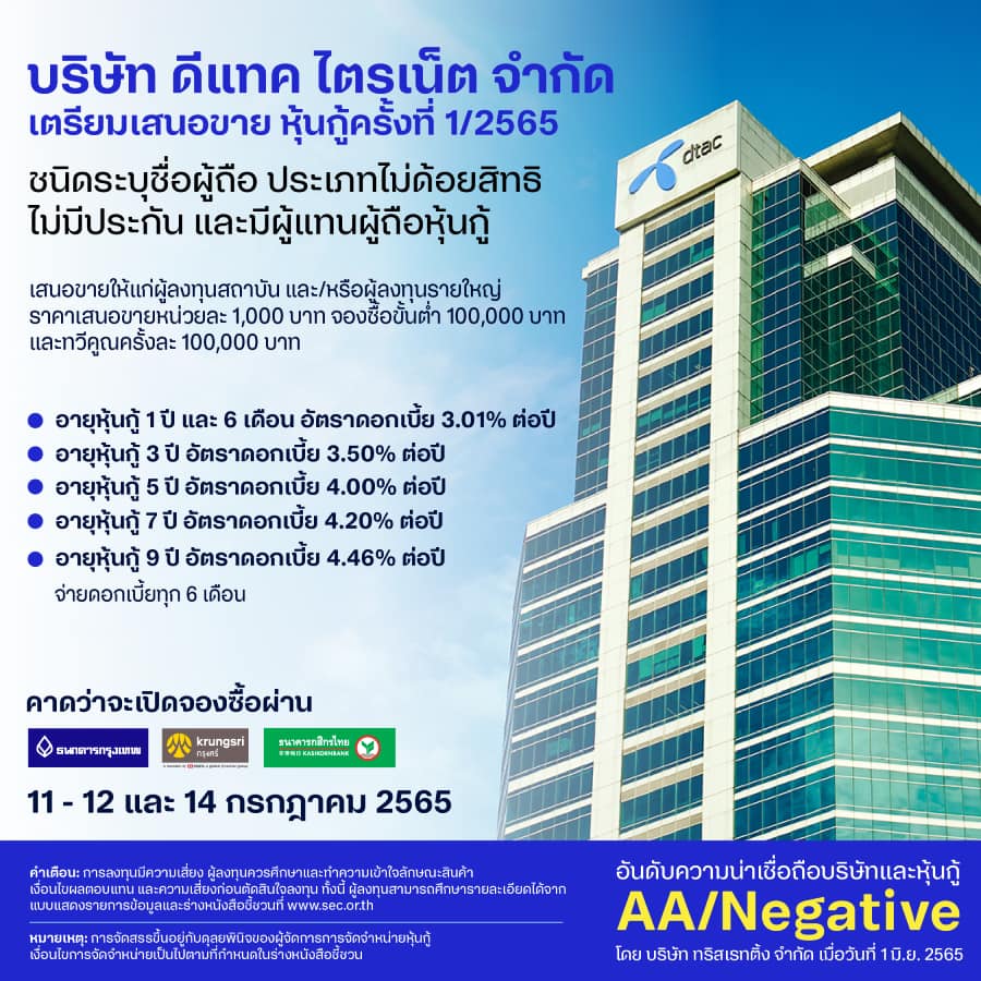 ดีแทค ไตรเน็ต ประกาศอัตราผลตอบแทน หุ้นกู้ 3.01 – 4.46% ต่อปี พร้อมเสนอขายผู้ลงทุนระหว่างวันที่ 11 – 12 และวันที่ 14 กรกฎาคม นี้