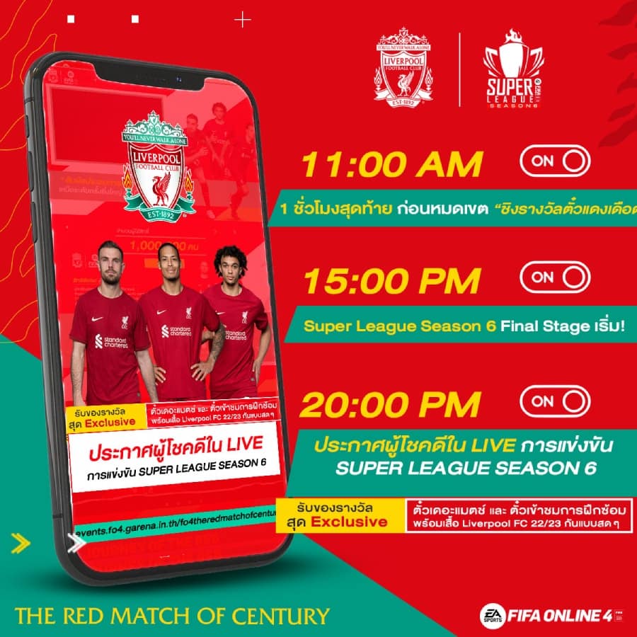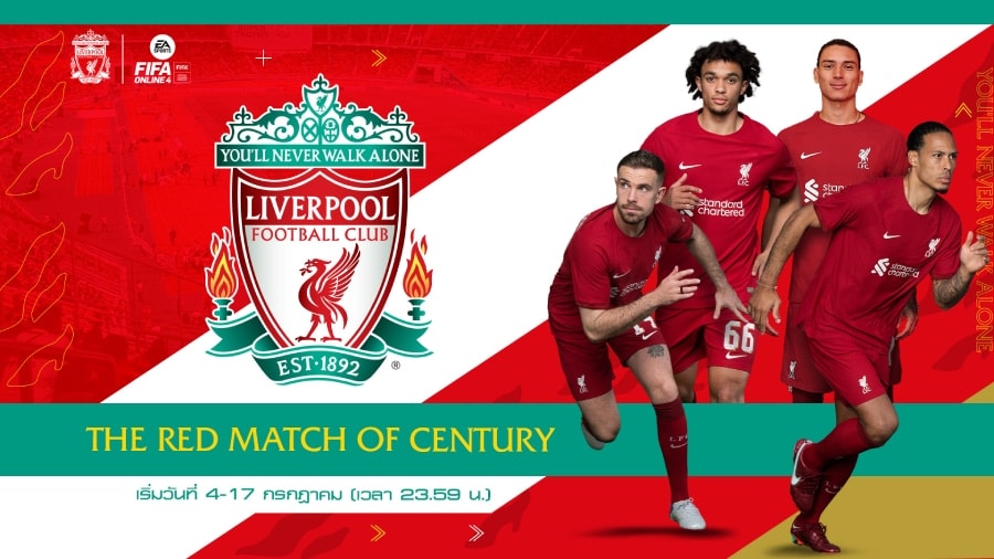 โอกาสสุดพิเศษกับเดอะแมตช์แสนวิเศษที่สโมสร Liverpool FC มอบให้กับผู้เล่นชาว FIFA Online 4 ทุกคนคือกิจกรรม “THE RED MATCH OF CENTURY” ที่เรียกได้ว่า จัดให้แบบสุดเดือด ทั้งรางวัลในเกม และนอกเกมอย่าง ตั๋วรับชมการซ้อม และการแข่ง รวมถึงเสื้อแข่งสโมสรฤดูกาลหน้าให้ทุกคนได้ชิงกันตอนนี้!