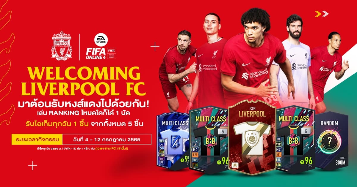นอกจากนี้ยังมีกิจกรรมเสริมต้อนรับหงส์แดงสู่เมืองไทยไปด้วยกัน! ได้ง่ายๆเพียงเล่น Ranking โหมดใดก็ได้ 1 นัด รับไอเท็ม 1 ชิ้น จากทั้งหมด 5 ชิ้น ขอแอบกระซิบหน่อยว่ามี Liverpool FC ICON ด้วยนะ แจกหนักเกิ้นน~ เล่นทุกวันได้ทุกวันนะแต่ของรางวัลแจกให้เฉพาะเล่นใน PC เท่านั้นน้า และกิจกรรมนี้หมดเขตวันที่ 12 กรกฎาคม 2565 เวลา 23.59 น. รีบไปเล่นกันได้เลย!