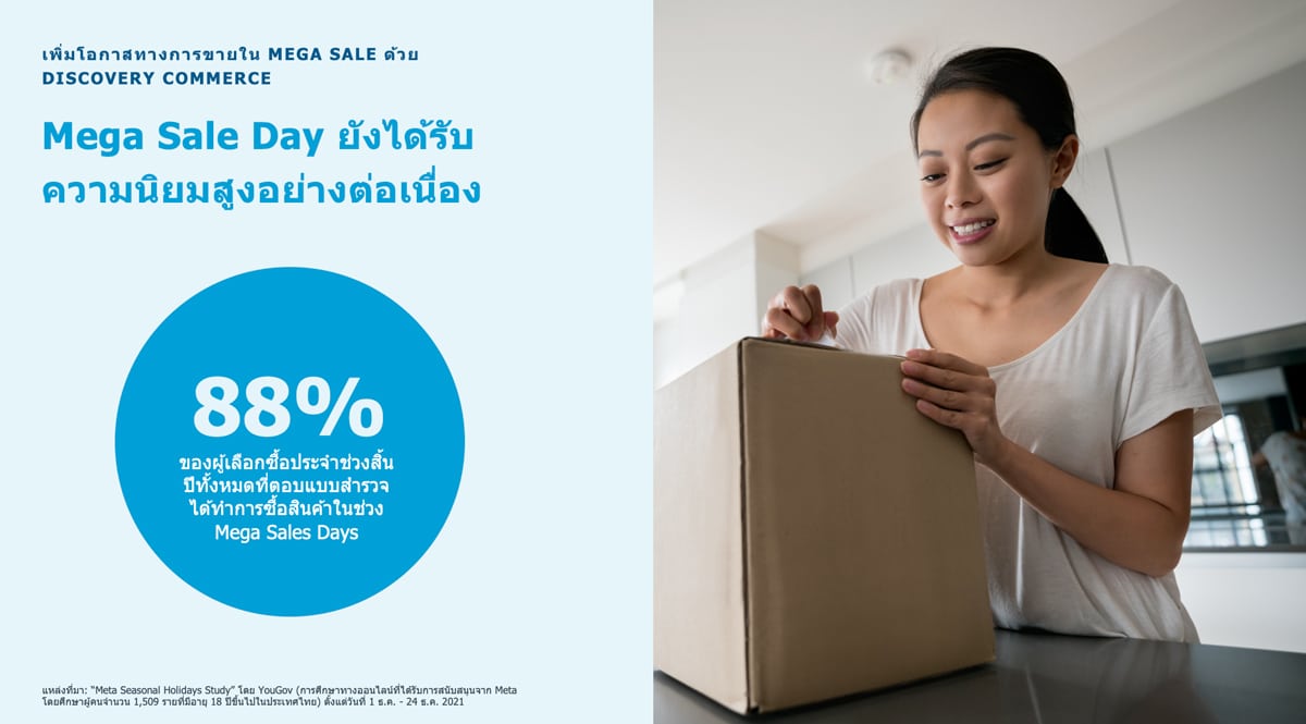 โดยยังคงเป็นช่วงเวลาที่ได้รับความนิยมอย่างต่อเนื่องสำหรับนักช้อป ทั้งนี้ 88% ของนักช้อปประจำช่วงสิ้นปีในประเทศไทยที่ตอบแบบสำรวจเผยว่าพวกเขามีการซื้อสินค้าในช่วง Mega Sale Days 94% ของนักช้อปช่วงสิ้นปี มีโอกาสที่จะเลือกซื้อสินค้าแบรนด์ใหม่ ๆ โดยเฉพาะอย่างยิ่งในหมวดหมู่สินค้าอิเล็กทรอนิกส์ (45%) เครื่องแต่งกายและแฟชั่น (43%) และอาหาร (41%) โดย 72% ของนักช้อปบอกว่าชอบที่ได้ค้นพบไอเท็มในความสนใจที่ก่อนหน้านี้พวกเขาไม่ได้มองหา ซึ่งกว่า 81% ของนักช้อปโซเชียลระบุว่าพวกเขาค้นพบสินค้าใหม่ ๆ ผ่านเทคโนโลยีของ Meta