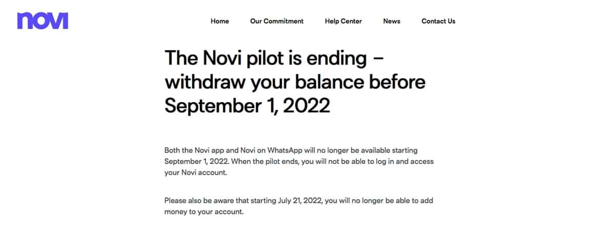 ผู้ใช้จะเสียสิทธิ์การเข้าถึงบัญชี Novi ในเดือนกันยายน 2022 และไม่สามารถเพิ่มเงินเข้ากระเป๋าเงินได้อีกต่อไปตั้งแต่วันที่ 21 กรกฎาคม 2022