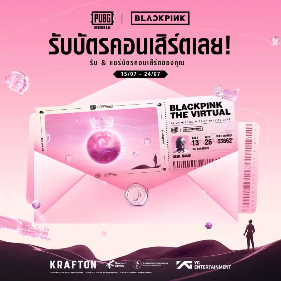 PUBG MOBILE ขอเพิ่มความฟินไปอีกขั้น ด้วยกิมมิกบัตรคอนเสิร์ต ที่สามารถรับได้ในเกม และนำมาตกแต่งเพิ่มความเก๋ให้บัตรคอนเสิร์ตในสไตล์ของตัวเอง พร้อมแชร์บนโซเชียลมีเดีย เพื่อรับไอเทมพิเศษจาก BLACKPINK ฟรี และยังสามารถส่งของขวัญให้สาว BLACKPINK เพื่อลุ้นรับของรางวัล อีกต่อ