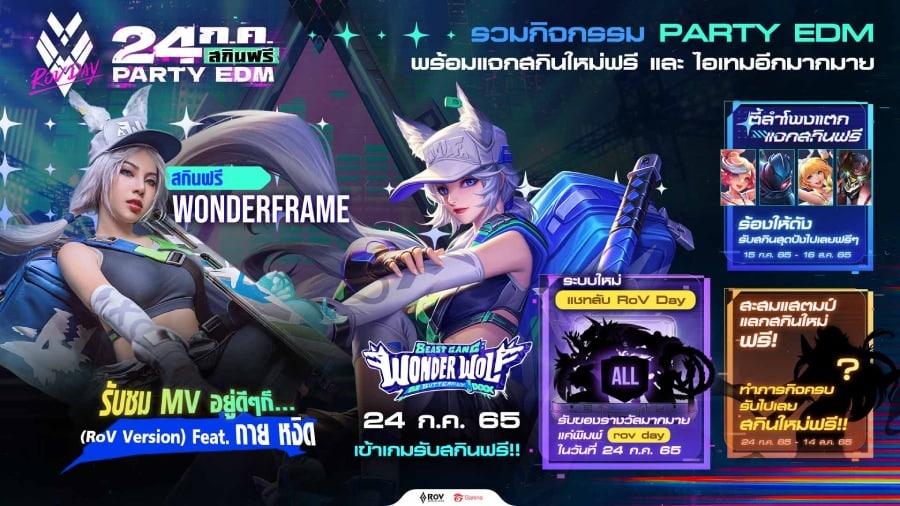 ในการเฉลิมฉลองปาร์ตี้ EDM สุดมันส์ครั้งนี้ ผู้เล่นทุกท่านสามารถดื่มด่ำและมันส์ไปกับประสบการณ์เพลงสุดพิเศษของ RoV และรับของรางวัลในเกม ไม่ว่าจะเป็นสกิน หรือเอฟเฟกต์ ผ่านการร่วมมือสุดพิเศษกับศิลปินแรปเปอร์ชื่อดัง WonderFrame ที่จะมา featuring กับคนดัง RoV อย่าง กาย หงิด ในการ Remake เพลงฮิตอย่าง อยู่ดีๆ…ก็ ในเวอร์ชัน RoV จะสนุก มันส์แค่ไหน รอติดตามกันให้ดี ๆ และย้ำอีกครั้งวันที่ 24 กรกฎาคมนี้ อย่าลืมเข้าเกมมารับสกินฟรี และกิจกรรมแจกของรางวัลมากมายภายในเกม