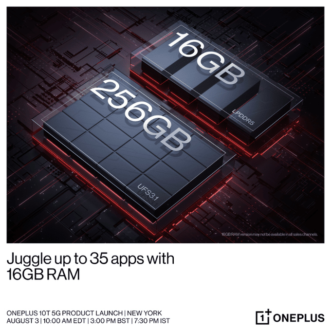 โดยทาง OnePlus ได้ให้ข้อมูลว่า RAM ขนาด 16GB จะทำให้ผู้ใช้ 10T สามารถเปิดใช้งานแอปพลิเคชั่นได้พร้อมกันถึง 35 แอปเลยทีเดียว