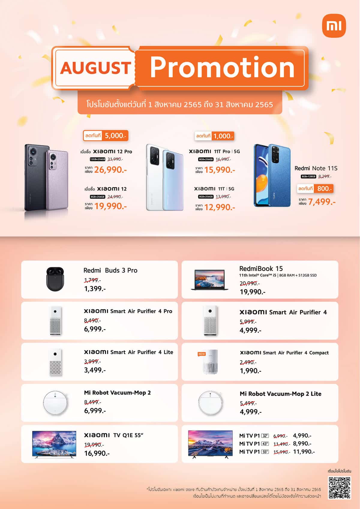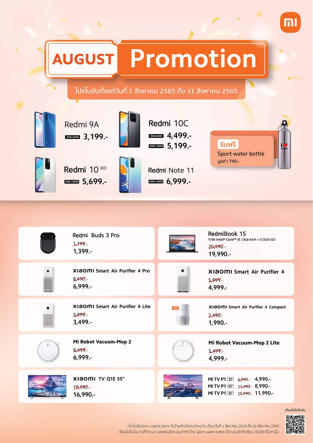 Xioami จัด โปรโมชั่น พิเศษตลอดเดือน สิงหาคม ยกขบวนสมาร์ทโฟน Xiaomi Redmi และผลิตภัณฑ์ AIoT ลดราคาพิเศษ พร้อมรับของสมนาคุณสุดคิ้วท์ ในระหว่างวันที่ 1 – 31 สิงหาคม 2565 ที่ Xiaomi Store และร้านตัวแทนจำหน่ายที่ร่วมรายการทั่วประเทศ