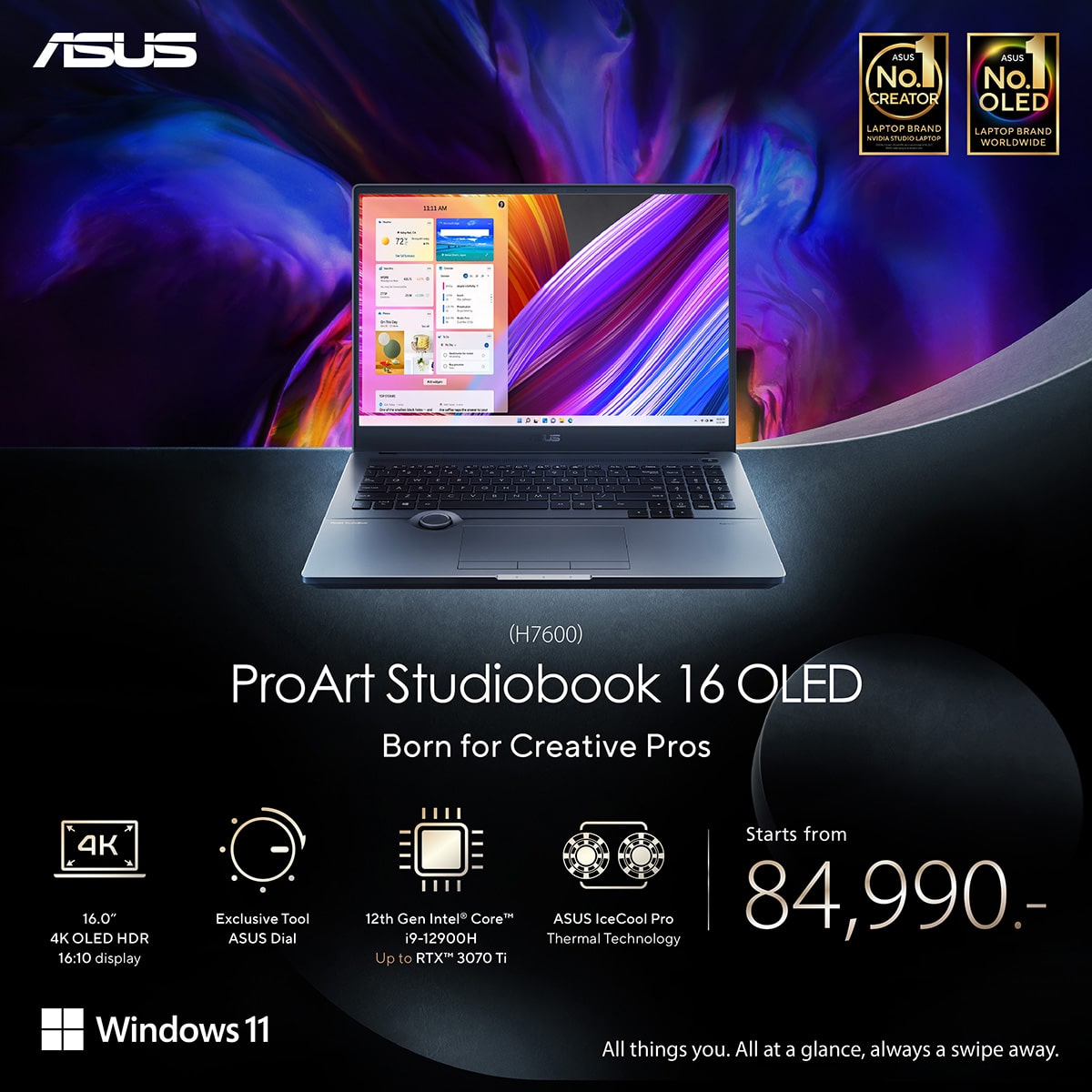ASUS ProArt Studiobook 16 (H7600) วางจำหน่ายแล้วตั้งแต่วันนี้เป็นต้นไป ราคา เริ่มต้น 84,990 บาท ณ ASUS Online Store และร้าน ASUS Exclusive Store ทั้ง 3 สาขา (สาขาเซ็นทรัลเวิลด์ พลาซ่า, สาขาเซ็นทรัล แจ้งวัฒนะ และสาขาเซ็นทรัล ระยอง) มาพร้อมการรับประกัน ASUS Exclusive Care ครอบคลุมการบริการซ่อมถึงที่ (on-site service) 3 ปี, ประกันระหว่างประเทศ 3 ปี 80 ประเทศทั่วโลก และประกันอุบัติเหตุ (Perfect Warranty) 1 ปีเต็ม พร้อมด้วย Windows 11 Home และ Pre-installed Office Home & Student 2021 ติดตั้งพร้อมใช้งาน พร้อมรับสมาชิก Adobe Creative Cloud® ฟรี เป็นระยะเวลาสามเดือน