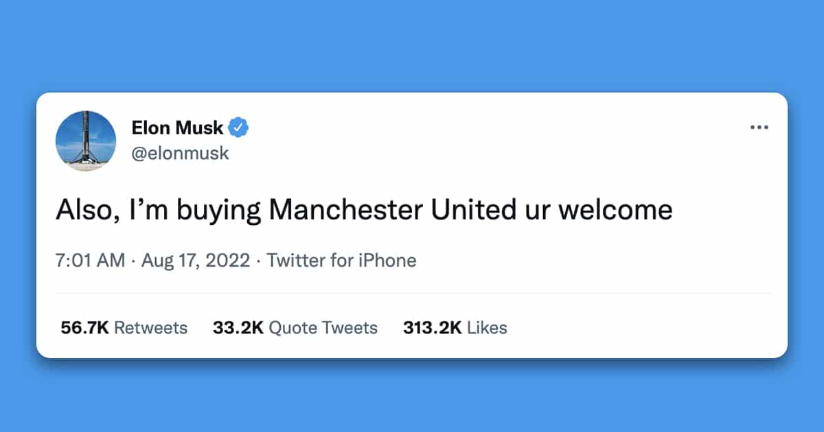 วันนี้ (17 สิงหาคม 2565) อีลอน มัสก์ (Elon Musk) มหาเศรษฐีที่เป็นเกรียนคีย์บอร์ดระดับโลก ได้ ทวีตข้อความ บอกว่า เขาจะซื้อสโมรสร แมนเชสเตอร์ยูไนเต็ด ทีมฟุตบอลชื่อดังระดับตำนานในพรีเมียร์ลีกอังกฤษ