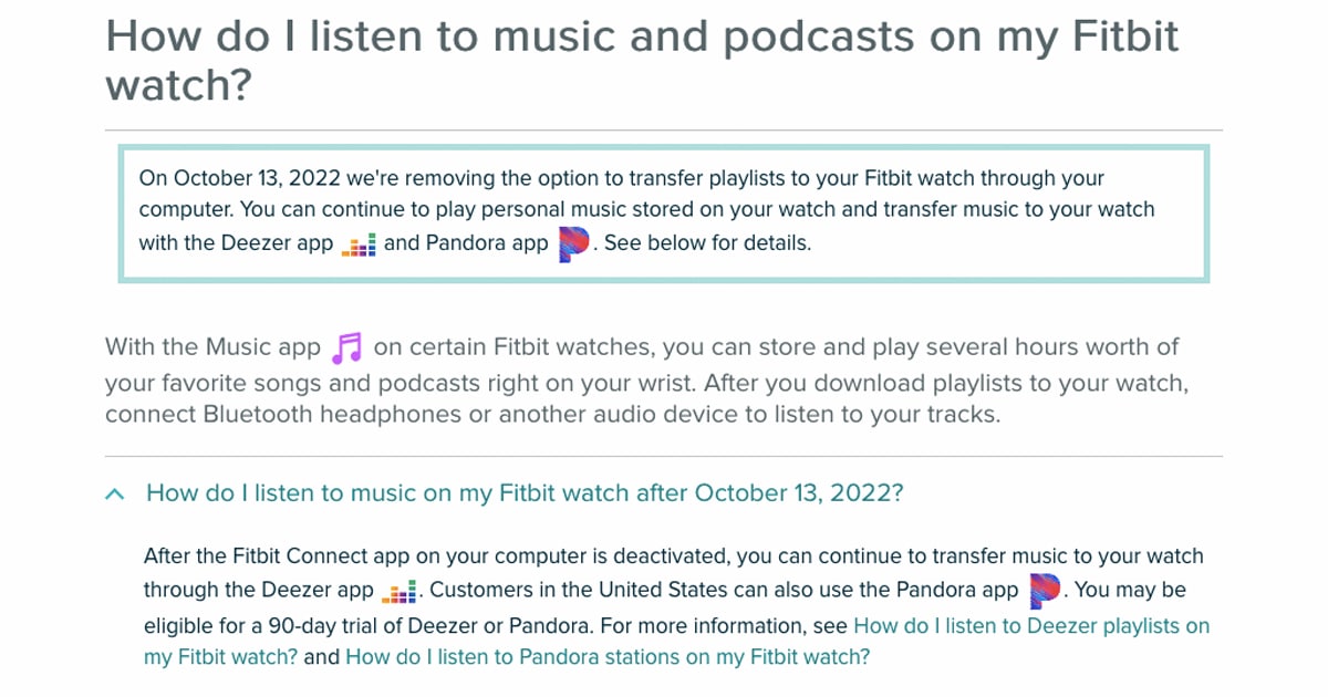 แน่นอนว่าการปิดการใช้งาน Fitbit Connect นั้นมีผลกระทบโดยตรงกับผู้ใช้ที่ซิงก์ไฟล์เพลงกับอุปกรณ์ PC / Mac เพื่อใช้ฟังเพลงแบบออฟไลน์ ซึ่ง Fitbit แนะนำให้เปลี่ยนมาใช้การซิงก์เพลงผ่านแอปที่รองรับอย่าง Pandora และ Deezer
