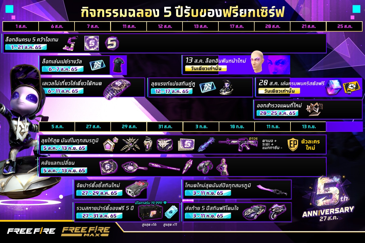 ตารางการแจกของรางวัลประจำสัปดาห์ เพื่อฉลองครบรอบ 5 ปีของ Free Fire