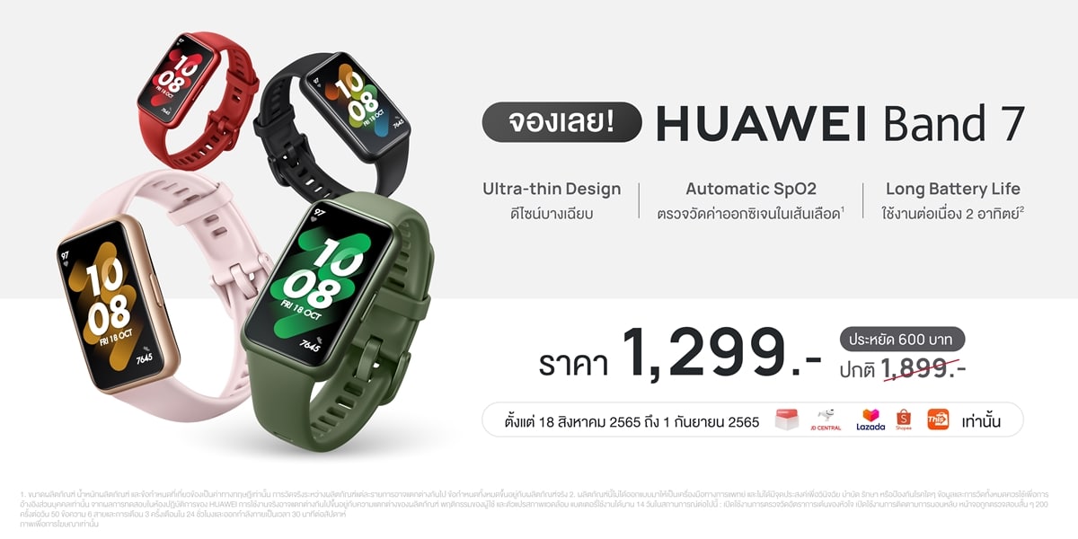 HUAWEI Band 7 เปิดตัวอย่างเป็นทางการในวันที่ 18 สิงหาคม 2565 นี้ เวลา 12:00 น. เป็นต้นไป จะมีจำหน่ายในประเทศไทยทั้งหมด 4 สีที่เข้ากับทุกลุค ได้แก่ Graphite Black, Nebula Pink, Wilderness Green และ Flame Red ราคา เพียงแค่ 1,899 บาทเท่านั้น! และเมื่อพรีออเดอร์ HUAWEI Band 7 ตั้งแต่วันที่ 18 สิงหาคม 2565 ถึงวันที่ 1 กันยายน 2565 นี้ รับไปเลยราคาสุดคุ้ม เหลือเพียงแค่ 1,299 บาท! โดยจะมีการจำหน่ายผ่านช่องทางออนไลน์เท่านั้นที่ HUAWEI Online Store และร้านค้าออนไลน์อย่างเป็นทางการของหัวเว่ยบนช่องทาง Shopee, Lazada, JD Central และ Thisshop