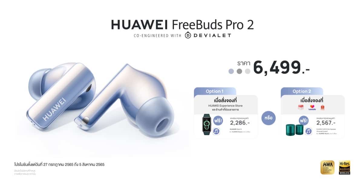 อย่าพลาด! หากสายเล่นเครื่องเสียงและหูฟังตัวจริงอยากรู้ว่า HUAWEI FreeBuds Pro 2 ตัวนี้เสียงดีขนาดไหน ก็คงต้องหามาลองพิสูจน์กับหูตัวเองเท่านั้น โดย HUAWEI FreeBuds Pro 2 มีราคาค่าตัวที่ 6,499 บาท พรีออเดอร์ระหว่างวันที่ 27 กรกฎาคม 2565 ถึง 5 สิงหาคม 2565 ที่หน้าร้าน HUAWEI Experience Store และร้านค้าที่ร่วมรายการ รับฟรี! HUAWEI Band 6 มูลค่า 1,899 บาท และ HUAWEI Music Premium ฟรี 3 เดือน มูลค่า 387 บาท หรือจะกดลงตะกร้าออนไลน์กันที่ HUAWEI Store และร้านค้าอย่างเป็นทางการของหัวเว่ยบน Shopee และLazada รับฟรี! HUAWEI Mini Speaker มูลค่า 2,180 บาท และ HUAWEI Music Premium ฟรี 3 เดือน มูลค่า 387 บาท