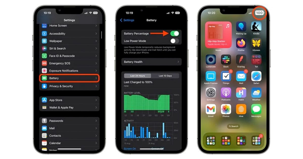 ตัวเลข เปอร์เซ็นต์แบตเตอรี่ บนหน้าจอ iPhone นั้น หายไปตั้งแต่เริ่มมีการเปลี่ยนดีไซน์เป็นจอที่มีติ่งอยู่ตรงกลาง และโดนเอาออกไปเพราะเหลือที่แสดงผลไม่พอ ซึ่งถ้าจะดูตัวเลขแบตเตอรี่ที่เหลือ จะต้องปัดเลื่อนเอาหน้า Control Center ลงมาก่อนจึงจะดูได้
