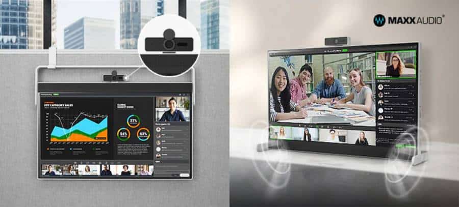 ตัวมอนิเตอร์มาพร้อมกล้องเว็บแคม ความละเอียด 1080p FHD ที่สามารถถอดออกได้ ซึ่งเป็นส่วนหนึ่งของอุปกรณ์เสริมที่เหมาะสำหรับการประชุมทางวิดีโอคอล พร้อมกับมีลำโพงเสียงสเตอริโอระบบ MAXXAudio