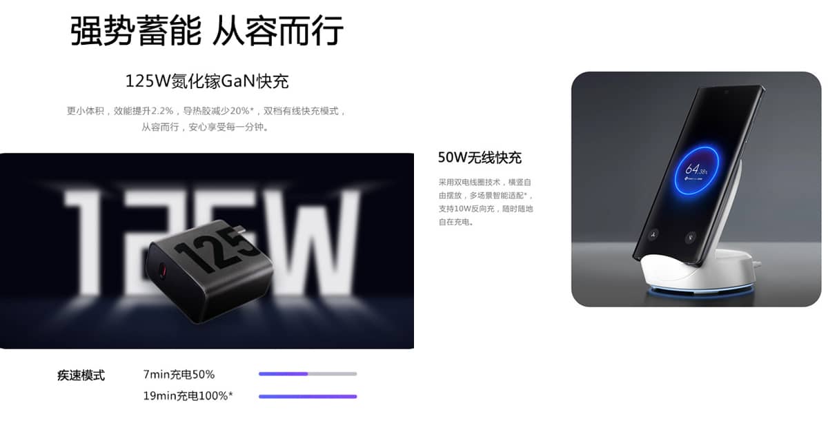 - รองรับการชาร์จไร้สาย 50W และชาร์จแบบมีสาย 125W ที่ชาร์จ 50% ในเวลา 7 นาที และชาร์จเต็ม 100% ในเวลาเพียง 19 นาที