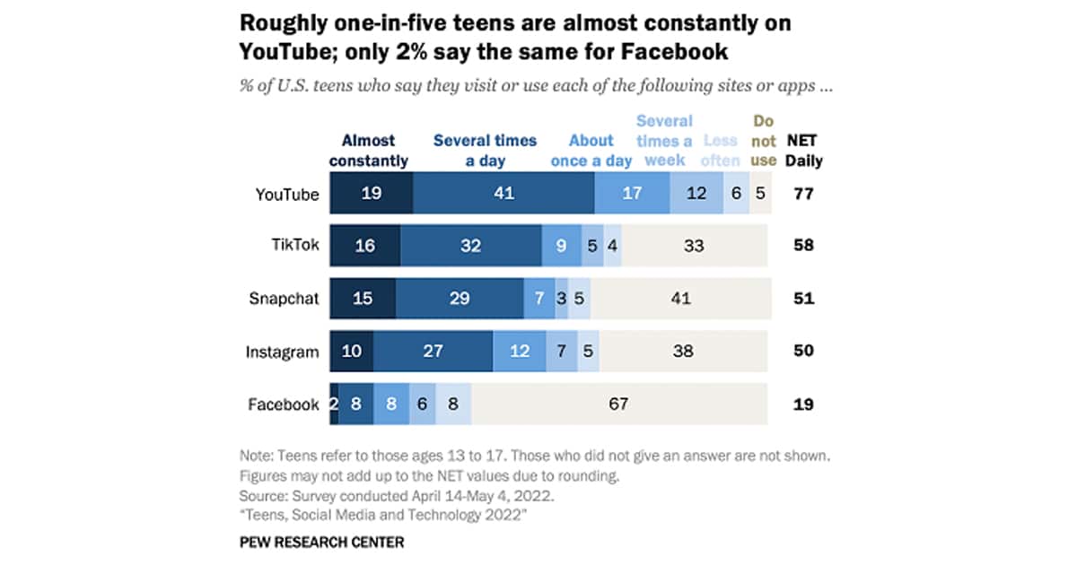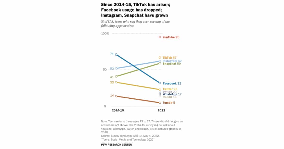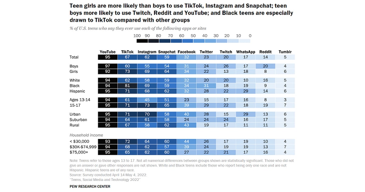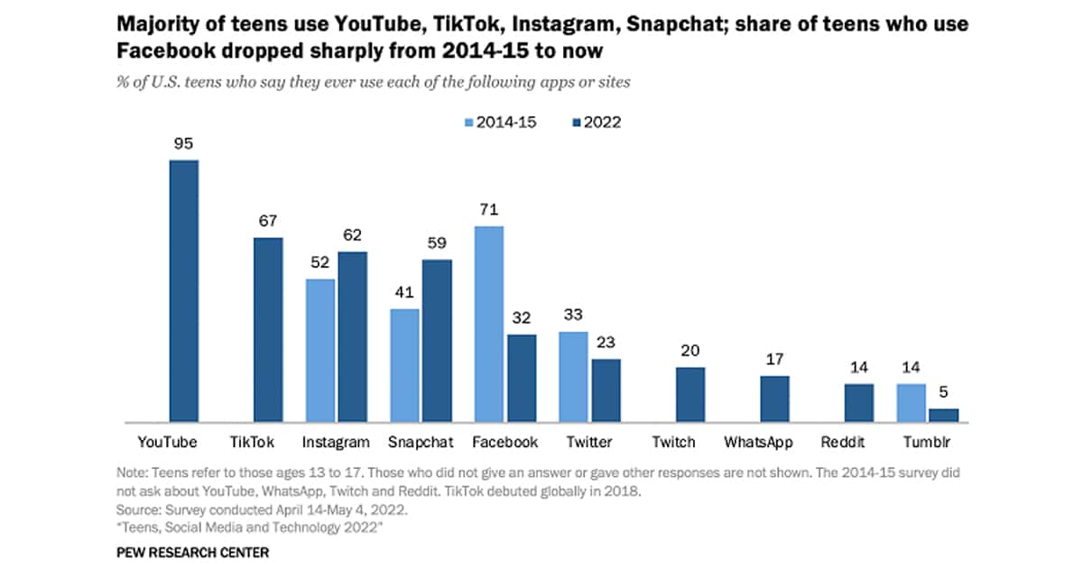 จากข้อมูลล่าสุดของ Pew Research ซึ่งทำการสำรวจวัยรุ่นและผู้ปกครองในสหรัฐอเมริกามากกว่า 1,300 คน ช่วงเดือนเมษายนถึงพฤษภาคมของปีนี้ เพื่อรวบรวมข้อมูลเชิงลึกให้มากขึ้นว่าแพลตฟอร์มใดกำลังเป็นที่ได้รับความสนใจหลักสำหรับผู้ชมที่อายุน้อย และเวลาที่พวกเขาใช้ไปในแต่ละแอป