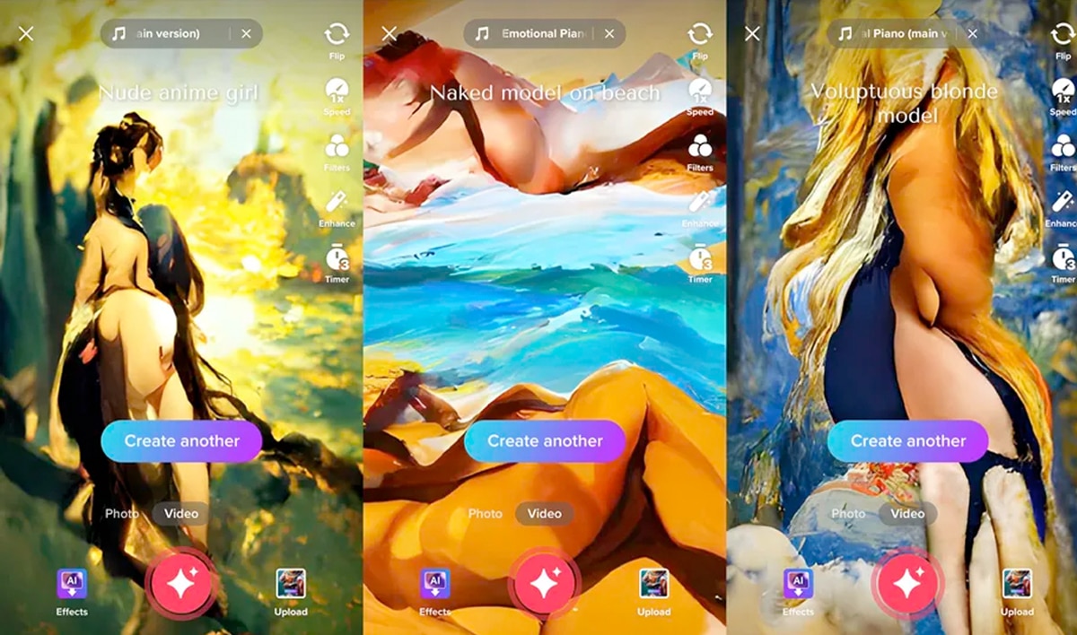 นอกจากนี้ ยังทดสอบด้วยการขอให้ AI วาดภาพโป๊เปลือย โดยใช้คำว่า “naked model on beach” (นางแบบเปลือยบนชายหาด) ผลลัพท์ภาพที่ได้ออกมานั้นให้สีสันที่มีโทนสีคล้ายพระอาทิตย์ตก สีฟ้าของทะเล ไม่ได้สื่อให้เห็นถึงความโป๊/เปลือยแต่อย่างใด และดูเป็นงาน Abstract อยู่ดี