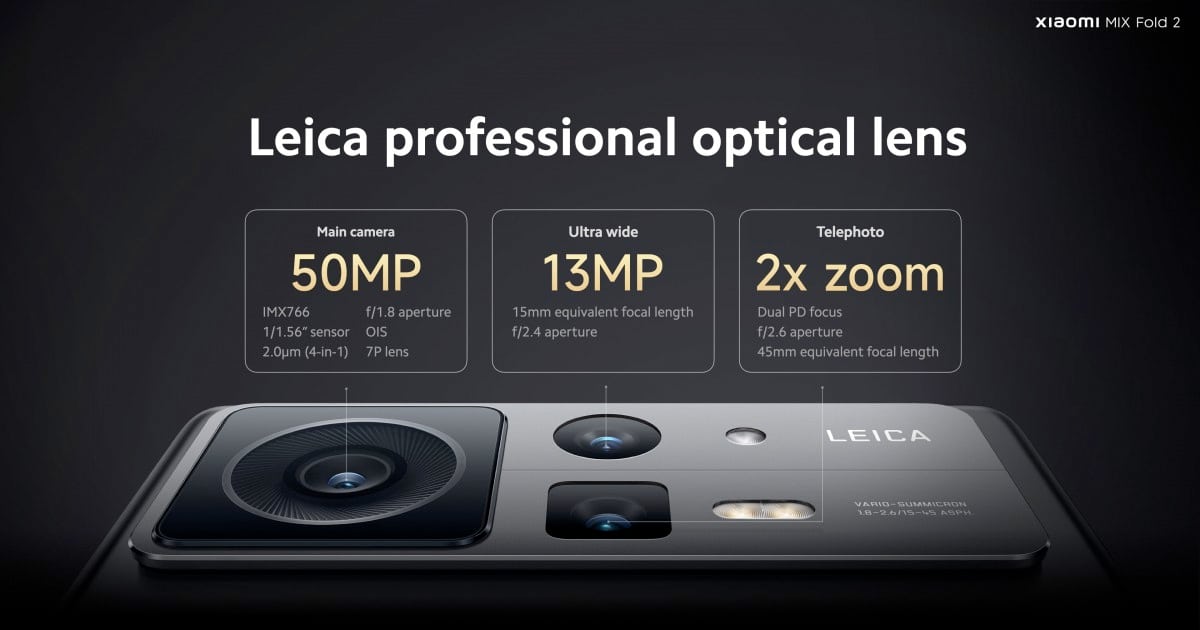 จุดแรก Xiaomi MIX Fold 2 นั้นได้รับการออกแบบแผงด้านหลังที่แตกต่างจากรุ่นก่อน มากับโมดุลกล้องที่เรียงตัวในแนวนอน เซ็นเซอร์ 3 ตัว พร้อมแบรนด์ Leica