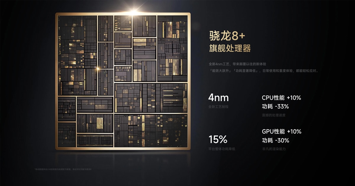 สเปคภายใน ใช้เป็นโปรเซสเซอร์ Snapdragon 8+ Gen 1 ที่ผลิตบนเทคโนโลยีระดับ 4nm มาพร้อม RAM 12GB และความจุสูงสุด 1TB แบตเตอรี่ 4,500 mAh รองรับการชาร์จไว 67W ในเรื่องของซอฟต์แวร์ ใช้ระบบปฏิบัติการ Android 12 ครอบด้วย MIUI 13