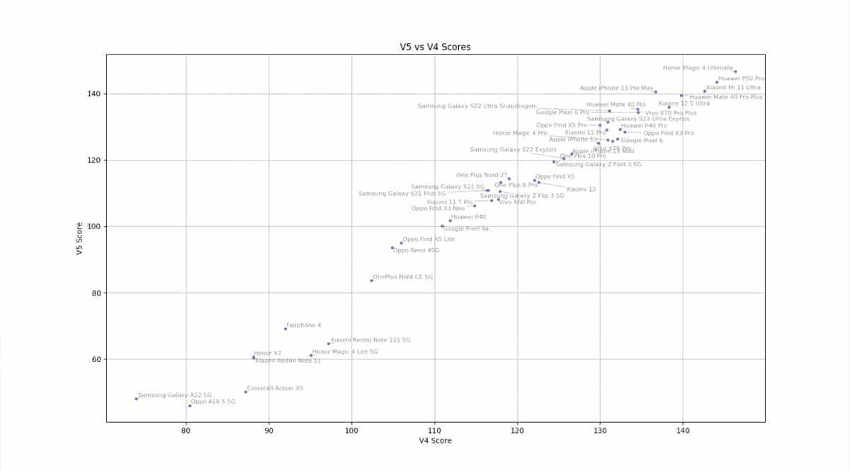 - Samsung Galaxy S22 Ultra (ตัวชิป Snapdragon) ได้คะแนน 135 คะแนน (เพิ่มขึ้น 4 คะแนนจากเวอร์ชันที่ 4) ขึ้นจากอันดับ 10 มาอยู่ที่อันดับ 8 ร่วม