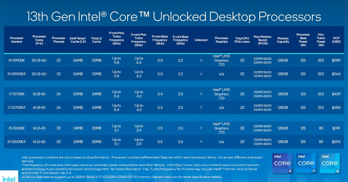 โดยการเปิดตัวโปรเซสเซอร์ Intel Core เจเนอเรชัน 13 ในครั้งนี้นั้น Intel ได้นำเอาโปรเซสเซอร์ตัวแรง 6 รุ่นที่มีรหัส K กับ KF มาเปิดตัวก่อน นำโดย Intel Core i9-13900K ที่เป็นตัวแรงสุด โดยโปรเซสเซอร์ตัวแรงนั้นช่วยให้ผู้ใช้สามารถเล่นเกมได้อย่างมีประสิทธิภาพมากขึ้น อีกทั้งยังช่วยเรื่องประสิทธิภาพของการทำงานด้วย