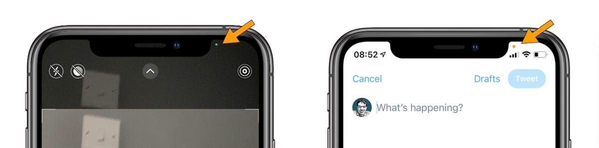 ปัจจุบัน Apple ได้ทำเป็นจุดสีส้มเล็กๆ ไว้ที่มุมขวาบนของจอแสดงผล โดยจะสังเกตเห็นเมื่อแอปพลิเคชันกำลังใช้ไมโครโฟนของ iPhone อยู่ หากผู้ใช้กำลังใช้แอปกล้องอยู่ จะปรากฎจุดสีเขียวขึ้นมาแทน โดย Apple จะทำการย้ายตัวบ่งชี้ตรงนี้เพื่อทำให้ผู้ใช้มองเห็นได้ชัดเจนขึ้น