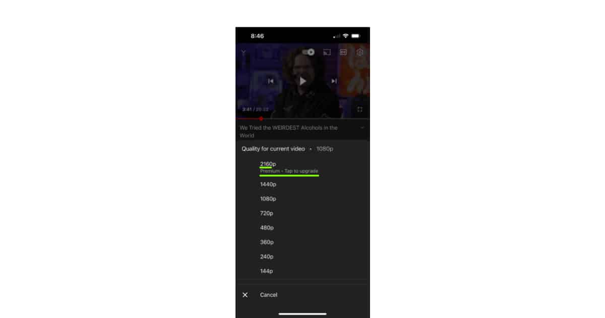 ผู้ใช้ Reddit ชื่อ u/Ihatesmokealarms โพสต์ภาพหน้าจอแอป YouTube บน iPhone ที่แสดงตัวเลือก 2160p (4K) ที่มีคำว่า “Premium” กำกับอยู่ด้านล่าวตัวเลขความละเอียดที่มาพร้อมลิงก์ “Tap to upgrade” เพื่ออัปเกรดสมาชิกเป็น YouTube Premium นอกจากผู้ใช้รายนี้แล้ว ยังมีผู้ใช้คนอื่นๆ รายงานสิ่งที่พบแบบนี้เหมือนกันบน Reddit