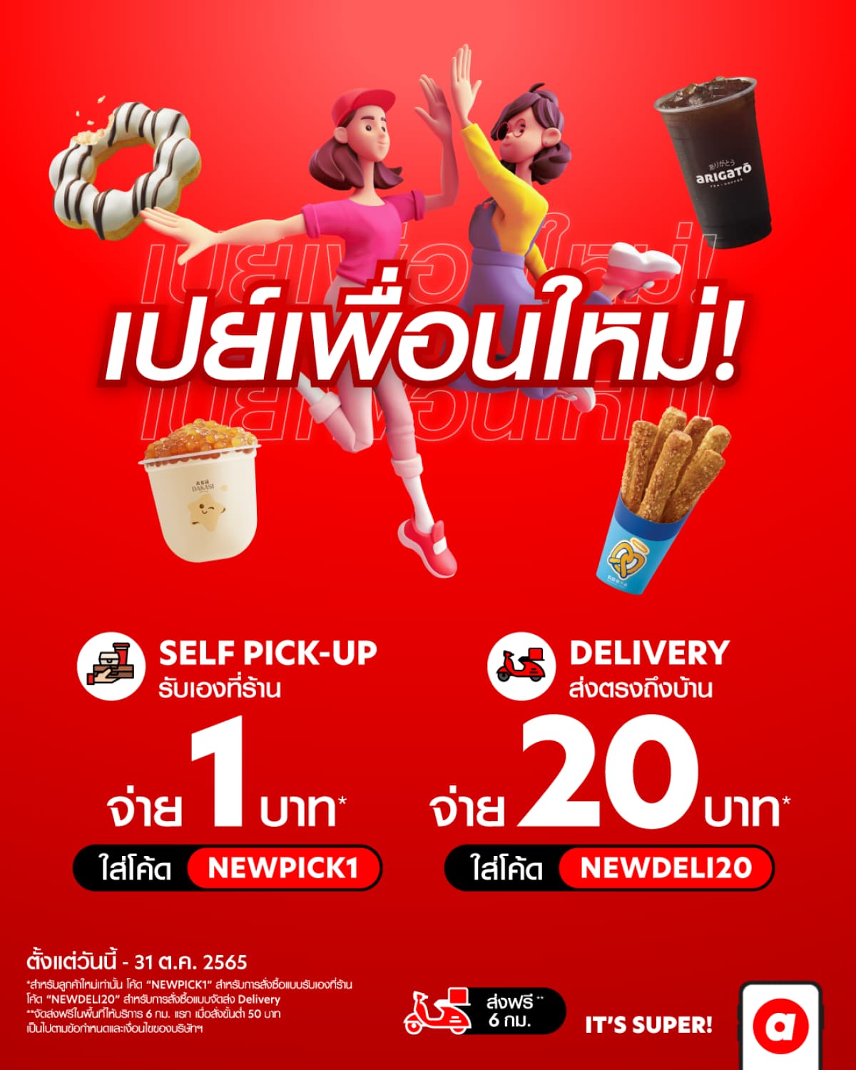 - ครั้งแรกกับ “airasia food เปย์เพื่อนใหม่” ด้วยโปรโมชั่น 1 บาท เมื่อใช้บริการสั่งอาหารเมนูที่ร่วมรายการแบบรับด้วยตนเองที่ร้าน ผ่านร้านค้าที่ร่วมรายการมากมาย อาทิ Auntie Anne’s, Arigato, กาแฟพันธ์ไทย, Mister Donut และ Olino Crepe เพียงใส่โค้ดส่วนลด “NEWPICK1” ซึ่งนอกจากบริการซื้อแบบรับด้วยตัวเองที่ร้านแล้ว ลูกค้าที่ใช้บริการ airasia food แบบเดลิเวอรี่ยังสามารถรับดีลเมนูพิเศษจากร้านค้าเหล่านี้ได้เช่นกันในราคาพิเศษเพียง 20 บาท เพียงใส่โค้ดส่วนลด “NEWDELI20” พร้อมส่งฟรีถึงบ้านทันที! 6 กม.แรก อย่ารอช้าตั้งแต่ 1-31 ตุลาคม 2565 นี้เท่านั้น