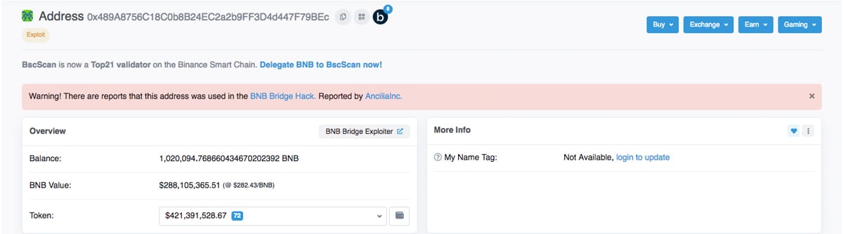 มีรายงานว่าผู้โจมตีได้แฮ็กผู้ใช้เครือข่าย BNB โดยมูลค่าความเสียหายน่าจะอยู่ที่ 2 ล้าน BNB หรือประมาณ 600 ล้านดอลลาร์