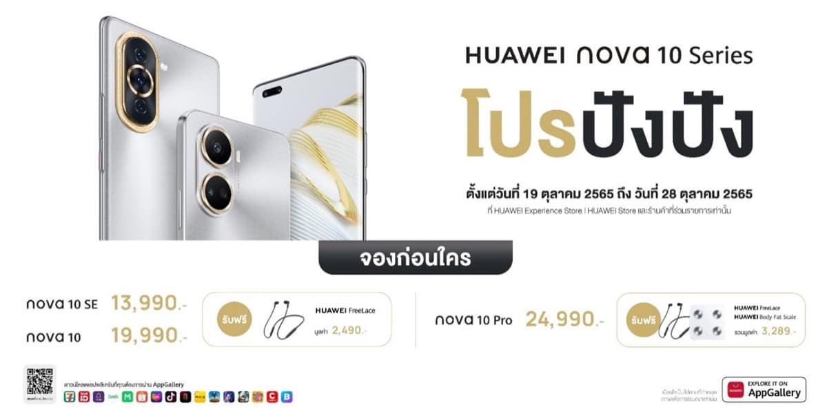 HUAWEI nova 10 Pro สุดยอดสมาร์ทโฟนพร้อมกล้องหน้าคู่ใหม่ชัดสูงสุด 60MP ถ่ายวิดีโอแบบ Auto-focus หน้าชัดหลังเบลอได้อัตโนมัติ พร้อมสปีดการชาร์จไวสูงถึง 100W HUAWEI SuperCharge Turbo มาพร้อมตัวเลือก 2 สี คือ Starry Blue และ Black วางจำหน่ายในราคา 24,990 บาท เมื่อสั่งซื้อตั้งแต่วันที่ 19 ตุลาคม 2565 ถึง 28 ตุลาคม 2565 ช่วงพรีออเดอร์ หน้าร้าน HUAWEI Experience Store และร้านค้าตัวแทนจำหน่ายที่ร่วมรายการ รับทันที! HUAWEI Body Fat Scale มูลค่า 799 บาท และ HUAWEI FreeLace มูลค่า 2,490 บาท และสั่งซื้อสินค้าทางเว็บไซต์ HUAWEI Store ร้านค้าอย่างเป็นทางการของหัวเว่ยบนแพลตฟอร์มออนไลน์ต่างๆ เช่น Shopee และ Lazada รับทันที HUAWEI Mini Speaker มูลค่า 1,090 บาท และ HUAWEI FreeLace มูลค่า 2,490 บาท และจะยังได้รับสิทธิประโยชน์พิเศษกับ HUAWEI Mobile Services เพิ่มไปอีกขั้น (รายละเอียดเพิ่มเติมใน QR Code ในภาพ)