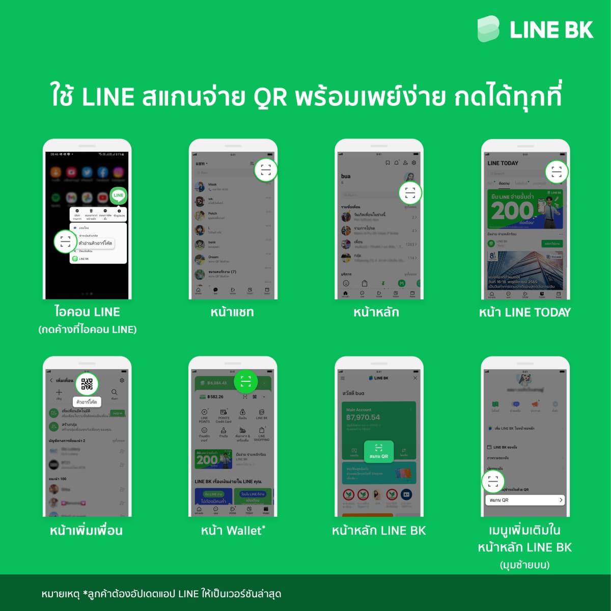 LINE BK เดินหน้าพัฒนาบริการทางการเงินให้ตอบโจทย์ไลฟ์สไตล์คนไทย ตอกย้ำจุดยืน ‘เรื่องเงินง่ายใน LINE คุณ’ ล่าสุดพัฒนาฟีเจอร์สแกน QR พร้อมเพย์ ผ่าน LINE เพียงแค่ผู้ใช้มีบัญชี LINE BK ซึ่งจะทำให้การโอนเงินหรือชำระค่าสินค้าและบริการเป็นเรื่องง่าย สามารถทำได้ในขณะที่กำลังใช้งานแอปพลิเคชัน LINE โดยไม่ต้องสลับแอป เพียงแค่กดที่สัญลักษณ์สแกน QR ที่มีถึง 8 ตำแหน่งใน LINE อาทิ หน้าหลัก (home) หน้าแชท (chat) หน้าวอลเล็ต (wallet) รวมถึงหน้าหลัก LINE BK