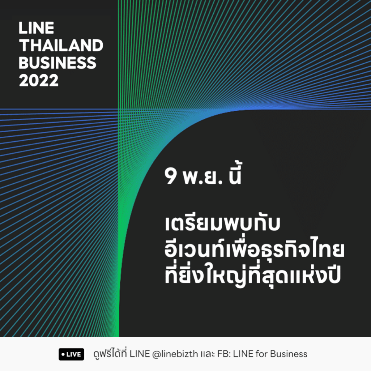 สำหรับผู้สนใจ สามารถรับชมออนไลน์ฟรี ไม่มีค่าใช้จ่าย! ผ่านทาง LINE Official Account: @linebizth, และ FB Fanpage: LINE for Business ตั้งแต่เวลา 10.00 น. เป็นต้นไป มาร่วมค้นหาคำตอบของธุรกิจไทย โอกาสการเติบโตสวนกระแสเศรษฐกิจโลกพร้อมกันได้ ที่นี่!