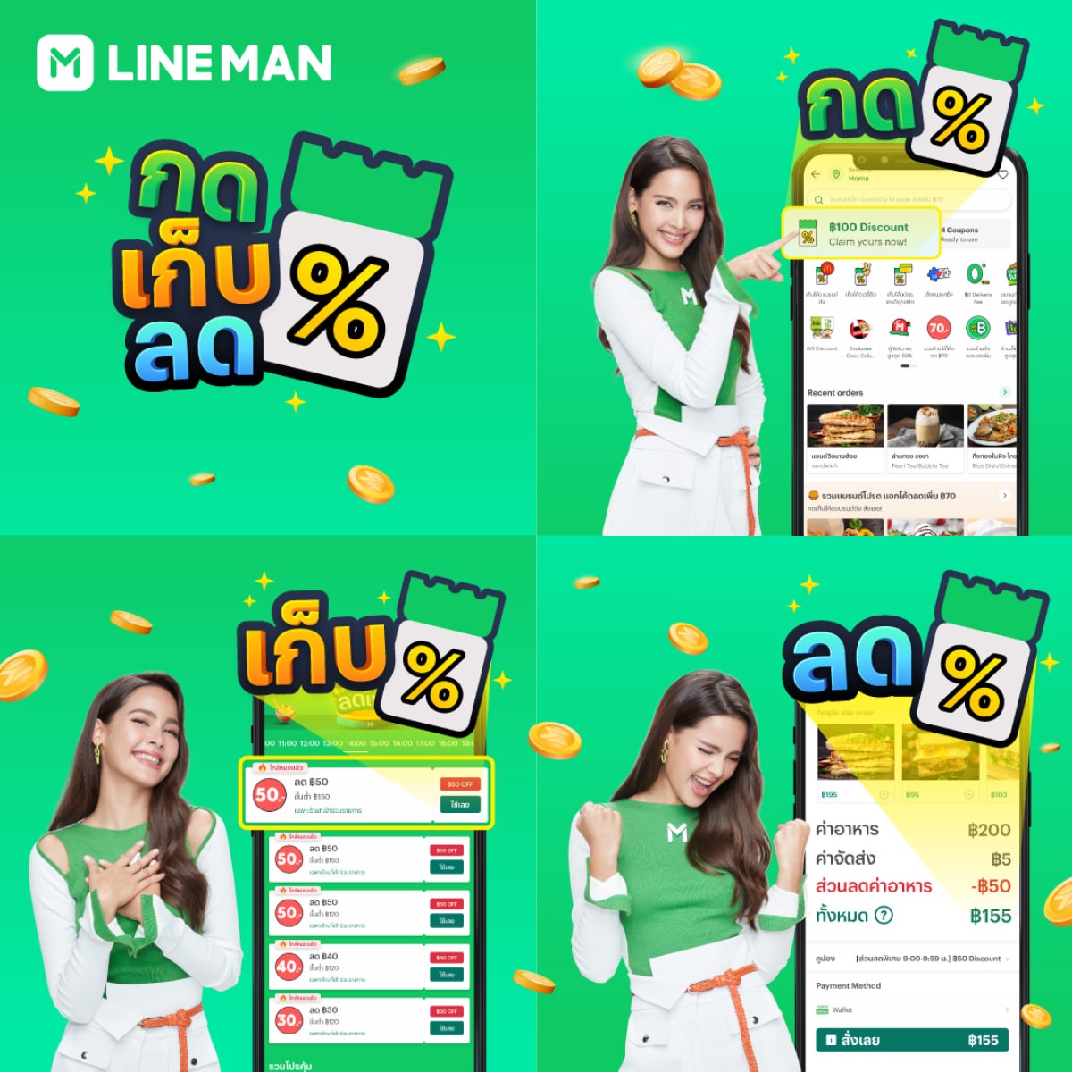 LINE MAN เปิดตัวแคมเปญ “เก็บโค้ดลดเพิ่ม” จัดเต็มโค้ดส่วนลดหลายต่อแบบไม่อั้น ให้คนไทยทั่วประเทศได้อิ่มอร่อยสุดคุ้มได้ทุกมื้อตลอดทั้งวันจากทั้งร้านอาหารชื่อดัง ร้านใหญ่และร้านเล็กใกล้บ้านที่ตบเท้าเข้าร่วมแคมเปญกว่า 50,000 ร้าน พร้อมดันพรีเซ็นเตอร์สาวสวย “ญาญ่า อุรัสยา” ในฐานะตัวแทนของผู้ใช้งานจริง มาสร้างสีสันชวน “กด เก็บ ลดกับญาญ่า” ด้วยโค้ดส่วนลดที่มีให้เก็บทั้งวัน เติมโค้ดเพิ่มทุกชั่วโมงแบบไม่อั้น มอบส่วนลดสูงถึง 60% และสามารถกดเก็บโค้ดลดเพิ่มได้อีกสูงสุดถึง 100 บาทต่อครั้ง นอกจากนี้ยังอำนวยความสะดวกด้วยการปรับโฉมแอปพลิเคชันให้ง่ายต่อการเก็บโค้ดส่วนลดมากขึ้นด้วยการรวบรวมทุกโค้ดส่วนลดมาไว้ภายในไอคอน “เก็บโค้ดลดเพิ่ม” ให้ลูกค้าได้เลือกใช้ไปเลยแบบจุก ๆ
