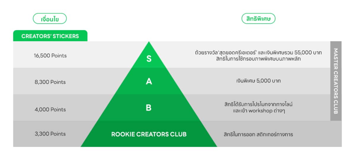 – สติกเกอร์ครีเอเตอร์ (Creators Stickers) ครีเอเตอร์จะได้รับโบนัส 5,000 บาท เมื่อสามารถสะสมแต้มเลื่อนระดับจาก Ranking B เป็น Ranking A และรับเงินเพิ่มอีก 50,000 บาท รวมเป็น 55,000 บาท พร้อมถ้วยรางวัลสุดยอดครีเอเตอร์ เมื่อสามารถสะสมแต้มได้เพิ่มจาก Ranking A เป็น Ranking S