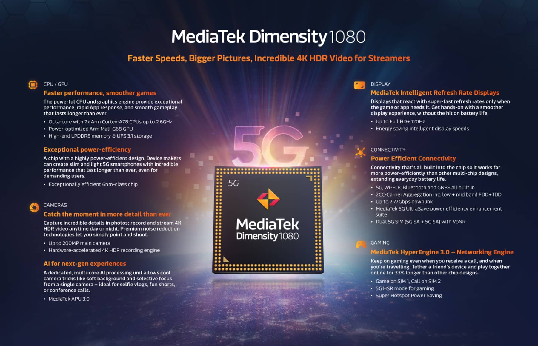 MediaTek แถลงข่าว เปิดตัว Dimensity 1080 ซึ่งเป็นชิปเซ็ตรุ่นล่าสุดจากกลุ่มผลิตภัณฑ์ Dimensity สำหรับสมาร์ทโฟน 5G อันเลื่องชื่อของบริษัท โดยมีศักยภาพสูงและได้อัปเกรดคุณสมบัติกล้องที่ดีขึ้นกว่าเดิมเมื่อเทียบกับ Dimensity 920