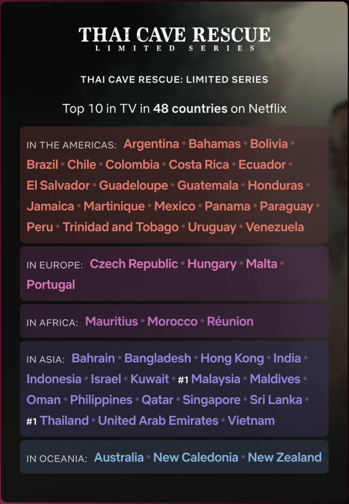 ถ้ำหลวง: ภารกิจแห่งความหวัง (Thai Cave Rescue) เป็นลิมิเต็ดซีรีส์ความยาว 6 ตอน ซึ่งพรีเมียร์เมื่อวันที่ 22 กันยายนที่ผ่านมา และพุ่งแรงขึ้นติดอันดับทั่วโลกทันทีในสัปดาห์ที่เปิดตัว โดยล่าสุดติด Netflix Top 10 ใน 48 ประเทศทั่วโลก ไม่ว่าจะเป็นออสเตรเลีย โปรตุเกส บราซิล สหรัฐอาหรับเอมิเรตส์ ฟิลิปปินส์ สิงคโปร์ เวียดนาม เป็นต้น และยังขึ้นแท่นอันดับ 1 ในประเทศไทยและมาเลเซียอีกด้วย ซึ่งนับเป็นการติดอันดับ Top 10 หมวดรายการทีวีภาษาต่างประเทศทั่วโลก ของ Netflix อย่างต่อเนื่องเป็นสัปดาห์ที่ 2 แล้ว