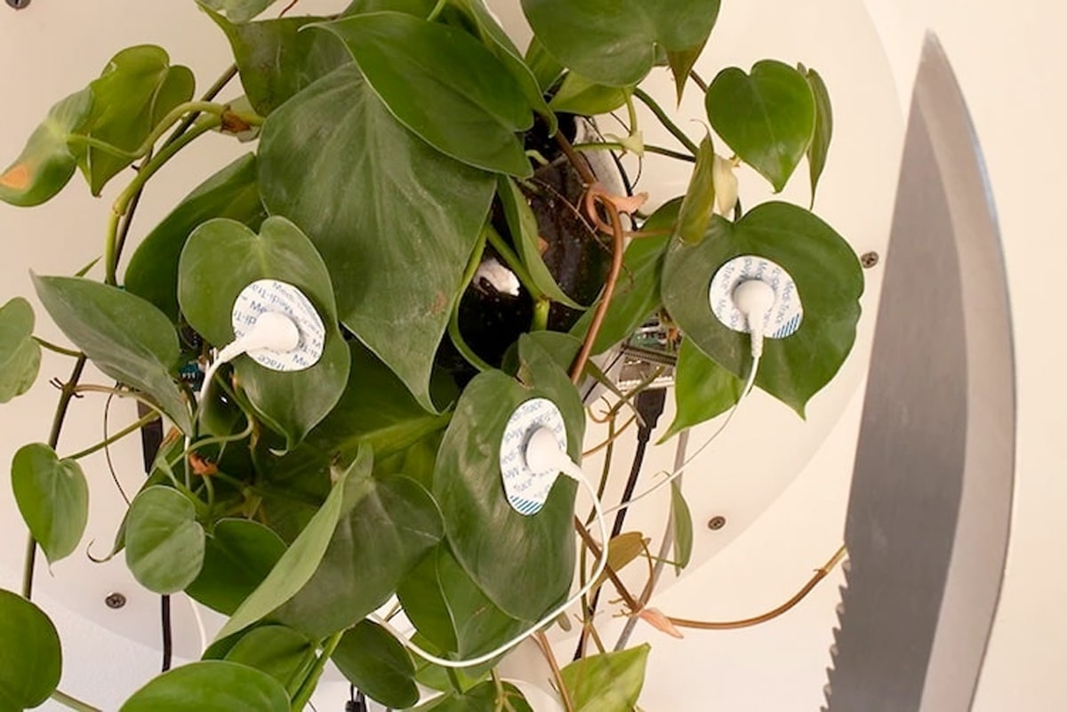 Bowen ติดเซนเซอร์เอาไว้กับใบของไม้เลื้อย philodendron เพื่อรับสัญญาณไฟฟ้าแล้วส่งต่อไปยังอุปกรณ์เชื่อมต่อทำให้แขนกลสามารถขยับในทิศทางต่างๆ ได้