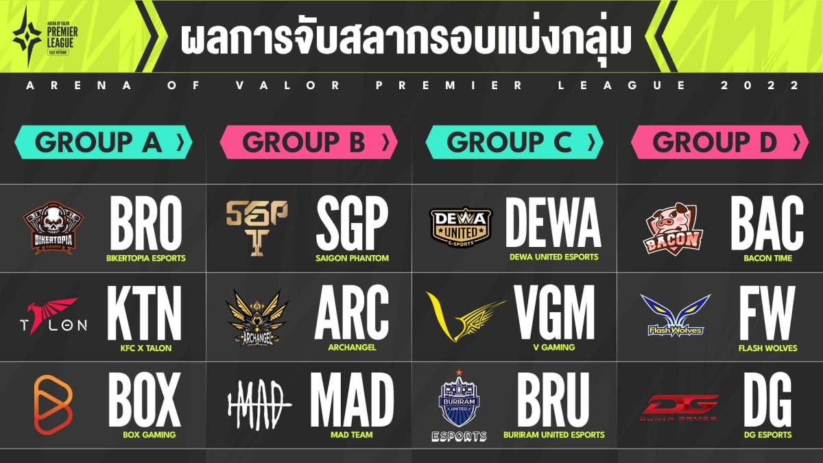 กลุ่ม A เรียกได้ว่านี่คือ Group of death ที่เต็มไปด้วยทีมตัวเต็งจากแต่ละลีก ทั้งแชมป์ GCS Summer 2022 อย่าง Bikertopia Esports และอันดับที่ 3 ของ AOG Winter 2022 อย่าง Box Gaming รวมถึง KFC x Talon ดีกรีแชมป์โลก AWC 2021 ส่วนในกลุ่ม B เราจะได้เห็นแชมป์ AOG Winter 2022 นั่นคือ Saigon Phantom พบกับอันดับ 2 ของ ASL Winter 2022 อย่าง ARCHANGEL และทีมแชมป์ AIC 2020 อย่าง MAD Team