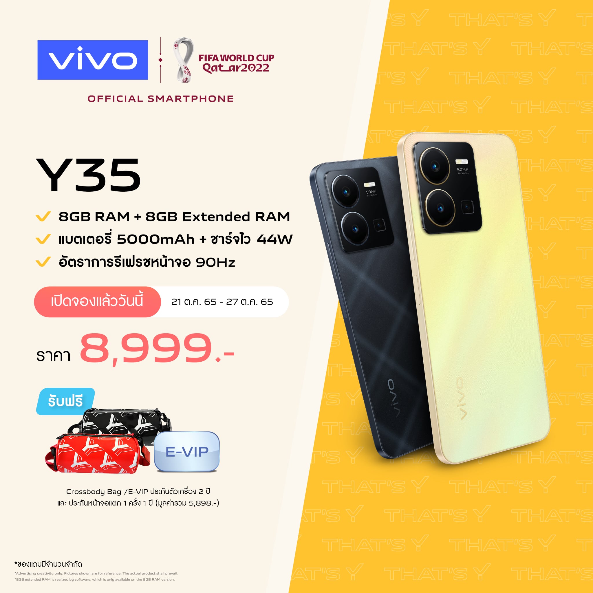 มาพร้อมกับข้อเสนอสุดพิเศษสำหรับลูกค้าพรีออเดอร์ vivo Y35 รับฟรีทันที กระเป๋า Crossbody EVIP Card ประกันตัวเครื่อง 2 ปี และประกันหน้าจอแตก 1 ครั้ง 1 ปี (รวมมูลค่า 5,898 บาท)