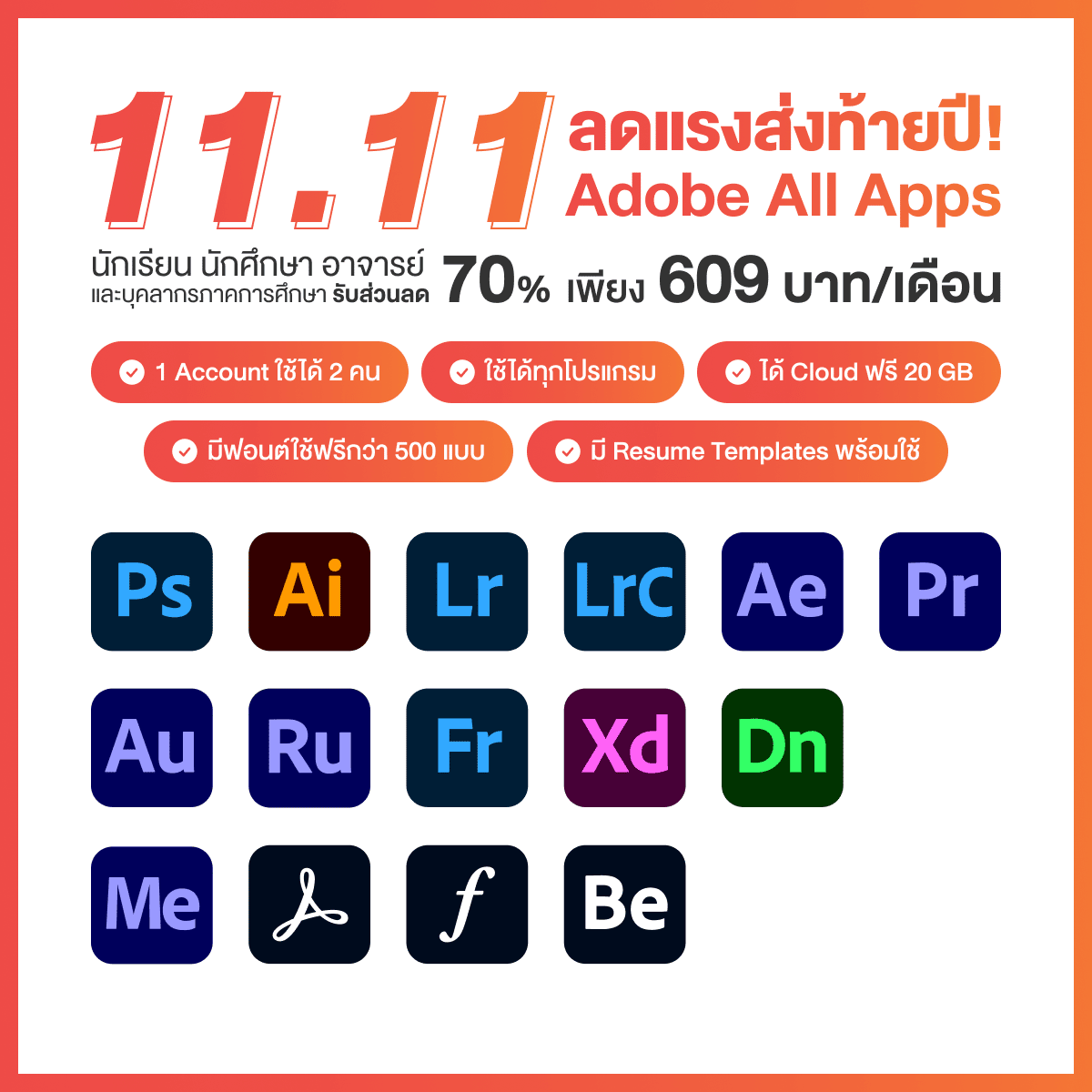 - Adobe Creative Cloud All Apps ลดราคา 70% ให้กับนักเรียน อาจารย์ และบุคลากรภาคการศึกษาทุกคน จากราคาปกติ 2,020.16 บาทต่อเดือน จ่ายเพียง 609.90 บาทต่อเดือน โดย 1 account สามารถ Sign in เพื่อใช้งานได้พร้อมกันถึง 2 คน