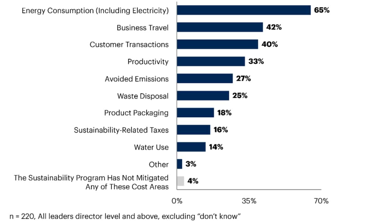 โดยเฉพาะอย่างยิ่ง ผู้ตอบแบบสำรวจระบุว่าโครงการความยั่งยืนกำลังช่วยลดต้นทุนให้กับประเด็นต่อไปนี้เป็นอันดับต้น ๆ ซึ่งประกอบด้วย การใช้พลังงาน (Energy Consumption) การเดินทางเพื่อธุรกิจ (Business Travel) และธุรกรรมของลูกค้า (Customer Transaction) (ตามรูปภาพที่ 1)