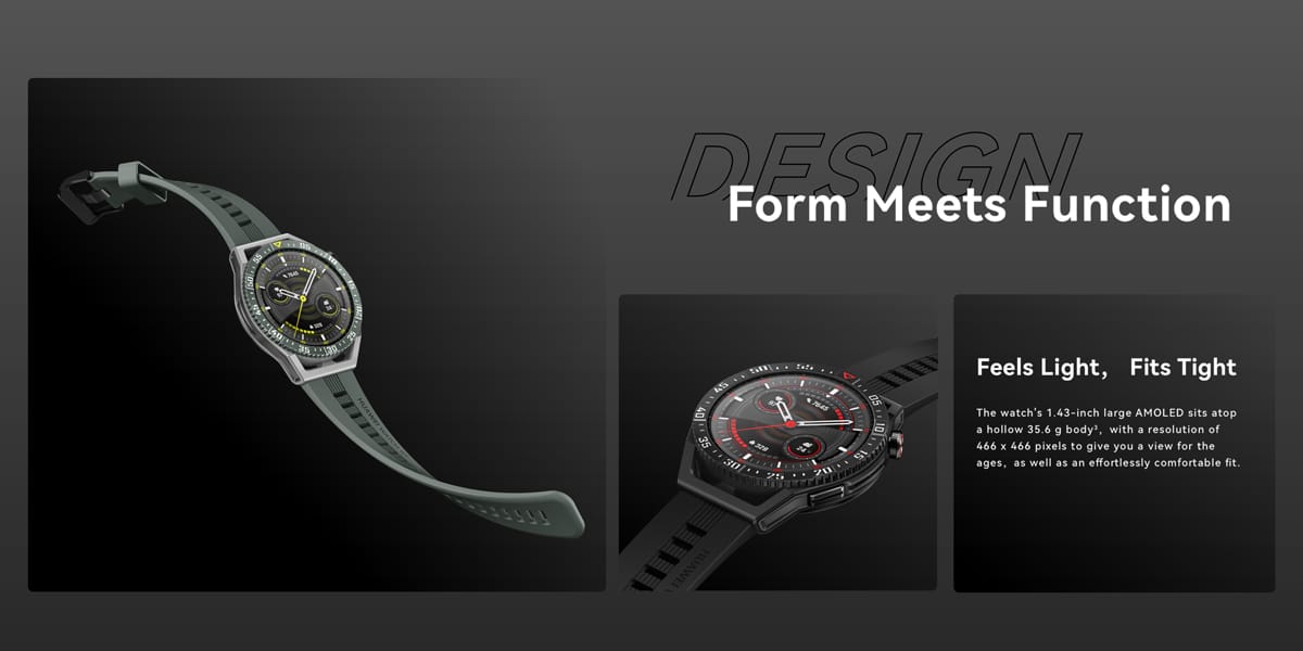 HUAWEI WATCH GT 3 SE โดดเด่นด้วยดีไซน์แบบ Open-Cut ที่ได้แรงบันดาลใจจากดีไซน์ของรถสปอร์ต โฉบเฉี่ยวและกระฉับกระเฉง เหมาะกับไลฟ์สไตล์แอคทีฟ สวมใส่สบายด้วยตัวเรือนบางเพียง 11 มม. และเบาเพียง 35.6 กรัมเท่านั้น ใช้หน้าปัดกลมแบบ AMOLED จอสีคมชัดสูง ขนาดใหญ่ 1.43 นิ้ว สะดวกต่อการใช้งานกลางแจ้ง และยังสามารถตั้งค่าหน้าจอให้พร้อมใช้งานเสมอด้วยโหมด Always-on Display หรือสามารถปิดใช้งานหากต้องการประหยัดแบตเตอรี่