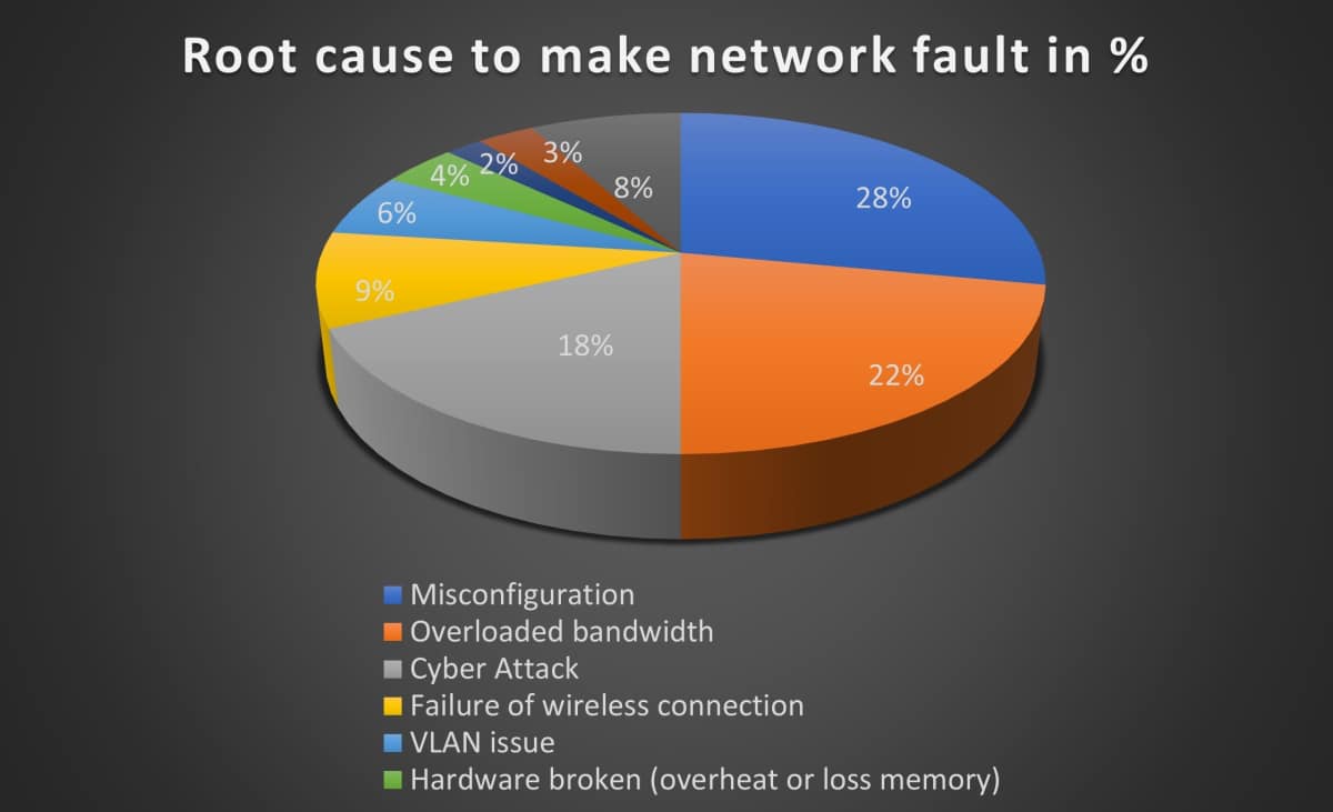 จากตารางเปรียบเทียบด้านบน สถาปัตยกรรมเครือข่ายแบบกระจายมีประโยชน์ในการช่วยให้การไหลของข้อมูลมีความยืดหยุ่นและเปิดกว้างมากขึ้น ความเป็นส่วนตัวและความปลอดภัยดีกว่าสถาปัตยกรรมแบบรวมศูนย์ อย่างไรก็ตาม ผู้ดูแลระบบไอทีจำเป็นต้องค้นหาสาเหตุของข้อผิดพลาดในระบบเครือข่ายด้วย จากรายงานของ Garner พบว่า 80% ของเวลาในการแก้ไขอินเทอร์เน็ตที่ผิดพลาดนั้นสูญเปล่าไปกับการค้นหาสาเหตุของข้อผิดพลาด ด้านประสิทธิภาพเครือข่ายและผลผลิตขององค์กรมีความสัมพันธ์ตามสัดส่วน กล่าวอีกนัยหนึ่ง ประสิทธิภาพของเครือข่ายที่มีประสิทธิภาพสูงจะเป็นประโยชน์ต่อประสิทธิภาพการทำงานและนำการพัฒนาในเชิงบวกมาสู่องค์กร จากแผนภูมิด้านล่าง ประมาณ 50% ของความผิดพลาดของเครือข่ายเกิดจากการกำหนดค่าผิดพลาดและแบนด์วิดธ์ที่โอเวอร์โหลด