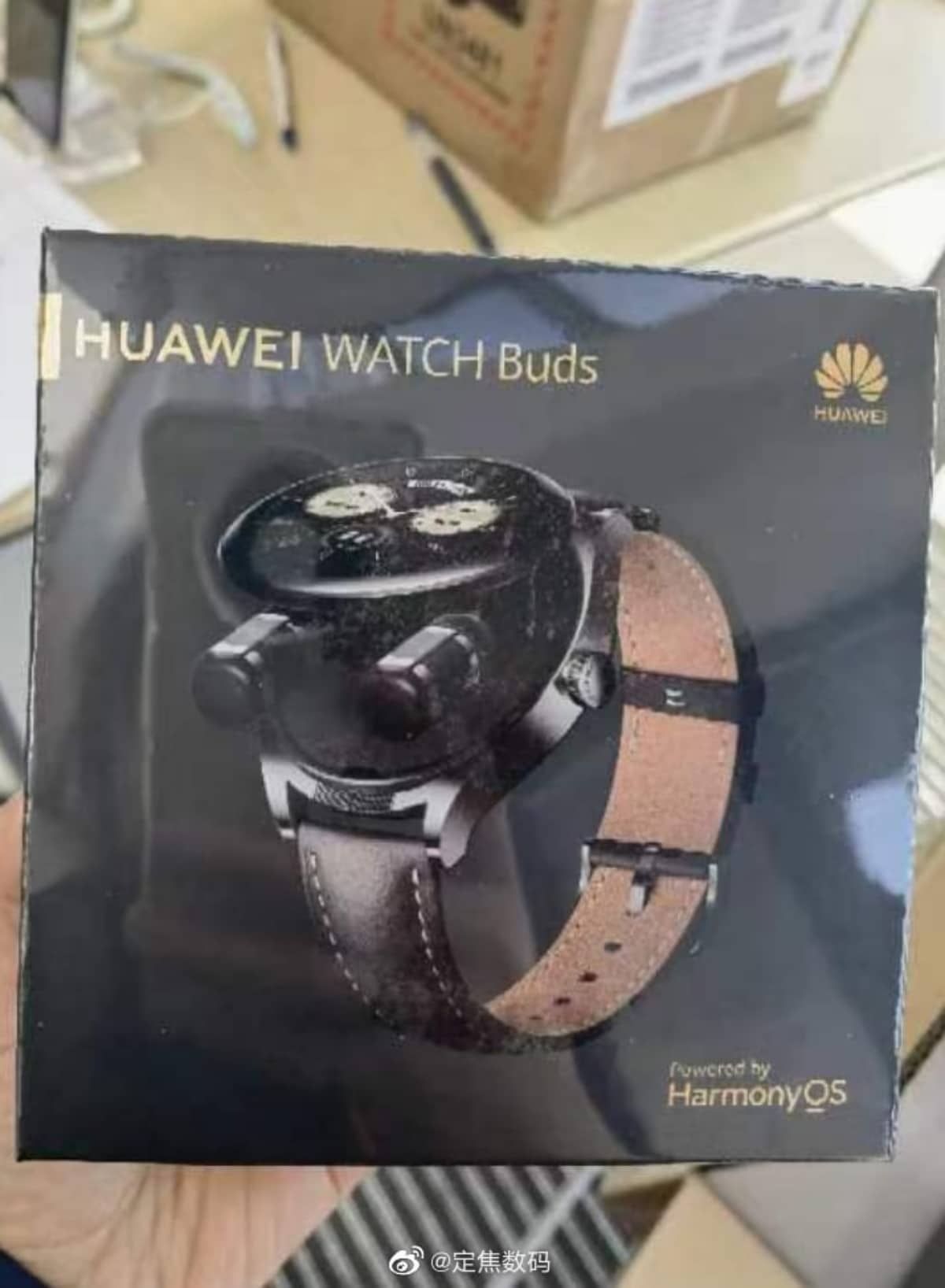 ภาพที่หลุดมานั้น มีตัวหนังสือระบุชัดบนกล่องนอกว่า ” HUAWEI Watch Buds ” หน้ากล่องเป็นรูปสมาร์ทวอทช์ที่สามารถใส่หูฟังเอียร์บัดทรงกระบอกเข้าไปในบริเวณหน้าปัดนาฬิกาได้