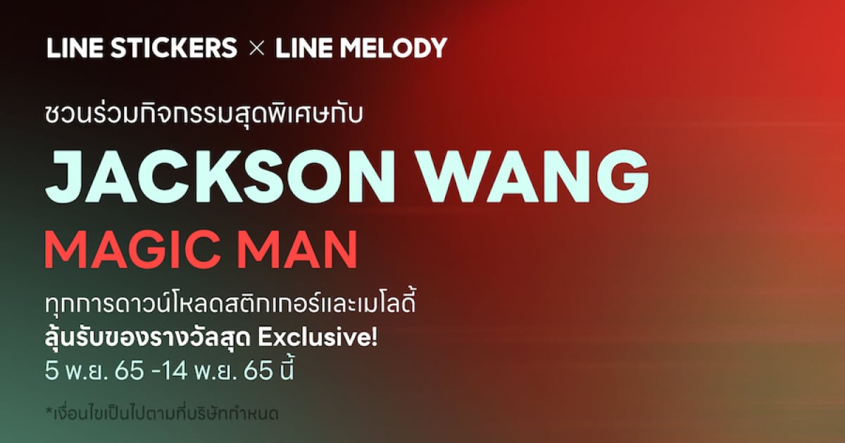 TEAMWANG ตัวจริงห้ามพลาด ชอป LINE STICKERS และ LINE MELODY เพื่อร่วมสนุกและลุ้นเป็นหนึ่งในผู้โชคดีที่ได้ร่วมงาน “JACKSON WANG MAGIC MAN FANMEET at The EmQuartier” ในวันที่ 29 พฤศจิกายนนี้ หรือรับของสินค้าพรีเมียม “MAGIC MAN” ต่าง ๆ มากมาย ได้ตั้งแต่วันที่ 5 ถึง 14 พฤศจิกายนนี้ โดยเงื่อนไขเป็นตามบริษัทฯ กำหนด