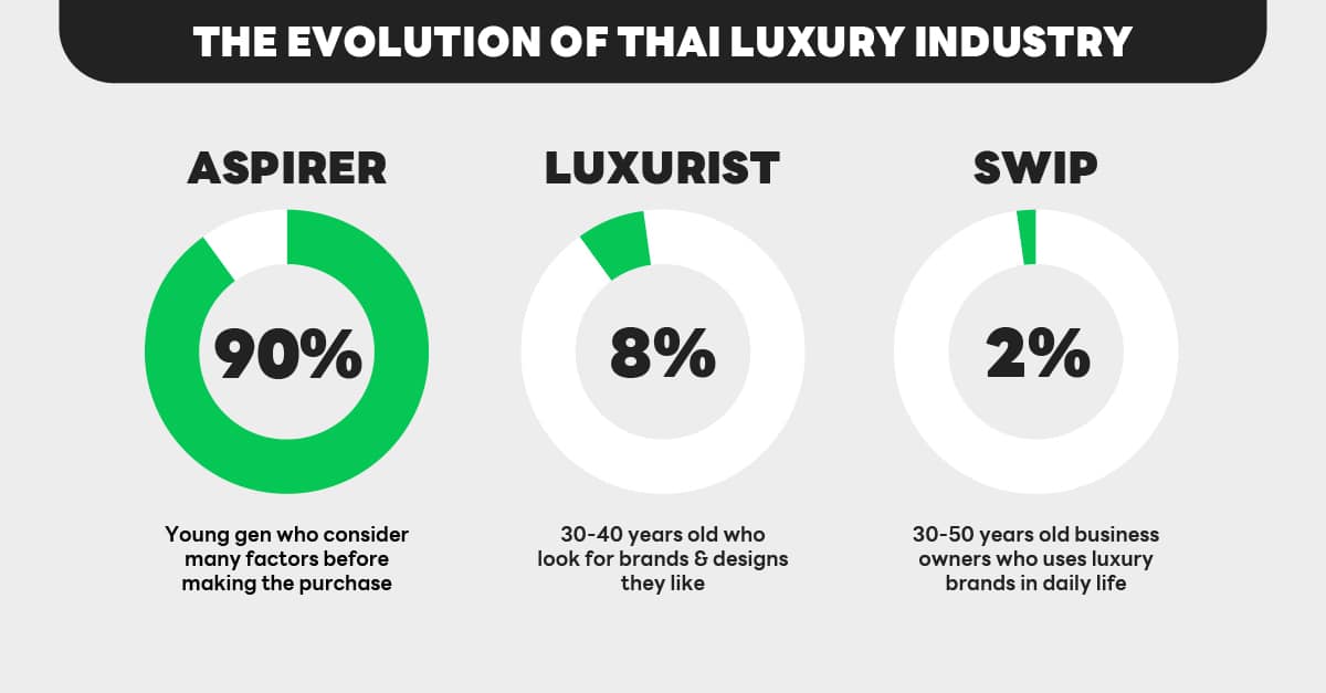 - The SWIP หรือ Super VVIP กลุ่มคนอายุ 30-50 ปี มีจำนวน 2% ส่วนใหญ่มีอาชีพเป็นเจ้าของธุรกิจ ผู้ประกอบการ คนกลุ่มนี้นิยมซื้อสินค้าแบรนด์หรูบ่อยและคาดหวังการบริการที่ดีที่สุด อีกทั้งเป็นกลุ่มที่ให้ความสำคัญด้านการดูแล ทะนุถนอมสินค้า และระมัดระวังการใช้งานมาก