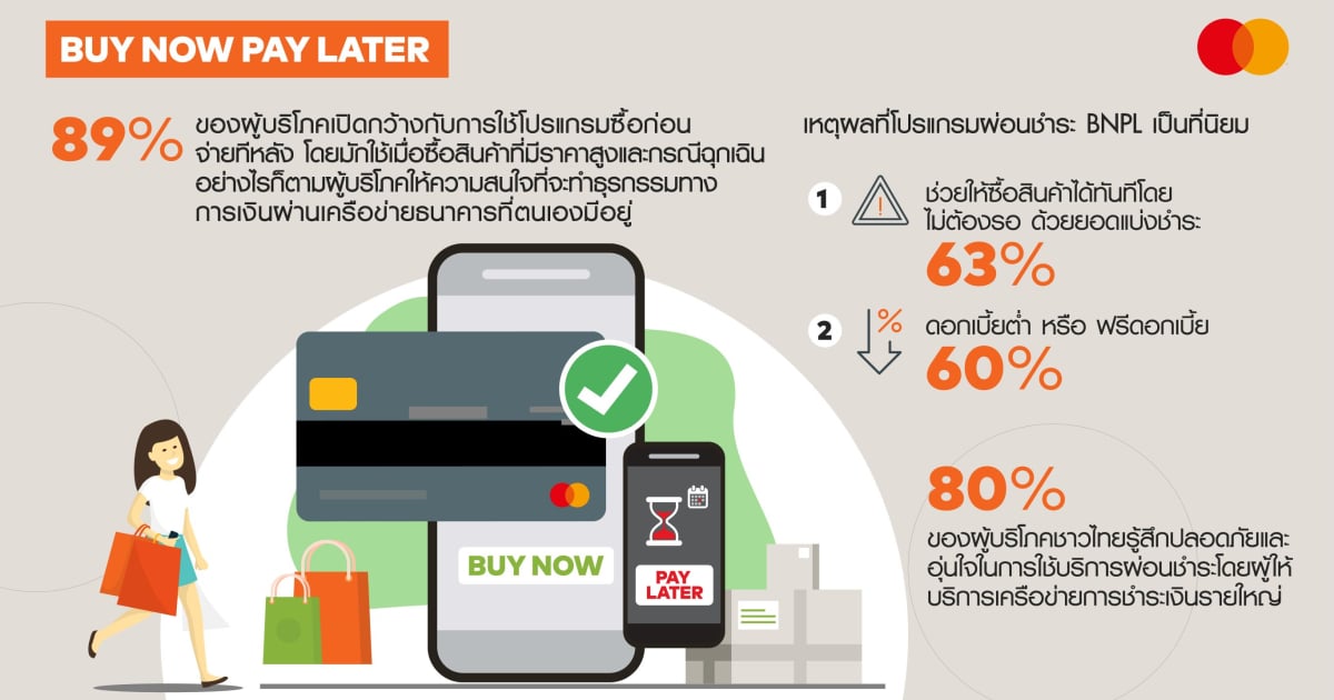 จากดัชนีผลสำรวจการชำระเงินของ Mastercard ในปี 2565 ชี้ว่าผู้บริโภคชาวไทย กว่า 89% รู้จักและคุ้นเคยกับโปรแกรม Buy Now Pay Later (BNPL) หรือซื้อก่อนจ่ายทีหลัง และการผ่อนชำระแบบ Installment plan ถึงแม้ว่ามีคนจำนวนไม่มากนักที่เลือกใช้งานในปีที่ผ่านมา แต่ในขณะเดียวกันผู้บริโภคส่วนมากเห็นว่าโปรแกรม BNPL/Installment plan ซึ่งให้บริการโดยสถาบันการเงินจะสร้างความน่าเชื่อถือและทำให้ผู้ใช้งานเกิดความสบายใจในการใช้ บริการผ่อนชำระ